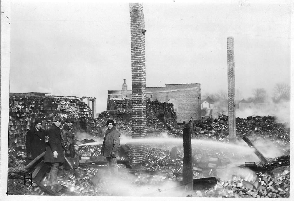 Donation, 07/26/2005. Black and white glossy photographic print in landscape format. Image is of several men walking in the debris left behind by the fire. They are holding a fire hose and continuing to spray the smoldering fire. Two chimneys still standing. On back in ink: "Fire at Fame Canning Co/1928/E. Wash. Shelbyville, Ind."Collection
