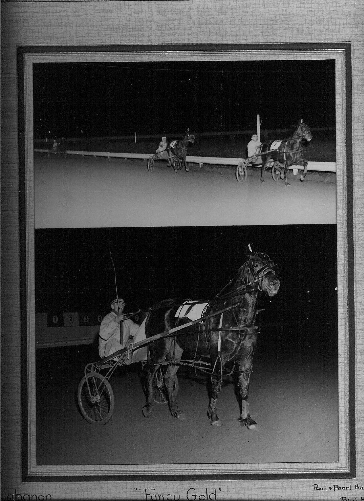 The top image is of Fancy Gold crossing the finish line well ahead of other horses. The bottom image is of Paul Hungerford at the reins of Fancy Gold for winner's photo. Information provided on the cardboard mount: Lebanon Raceway/Muddy Track/"Fancy Gold"/winning time 2:19 2/5 Date: 5-11-60/Paul & Pearl Hungerford owner/Paul Hungerford driver.Collection