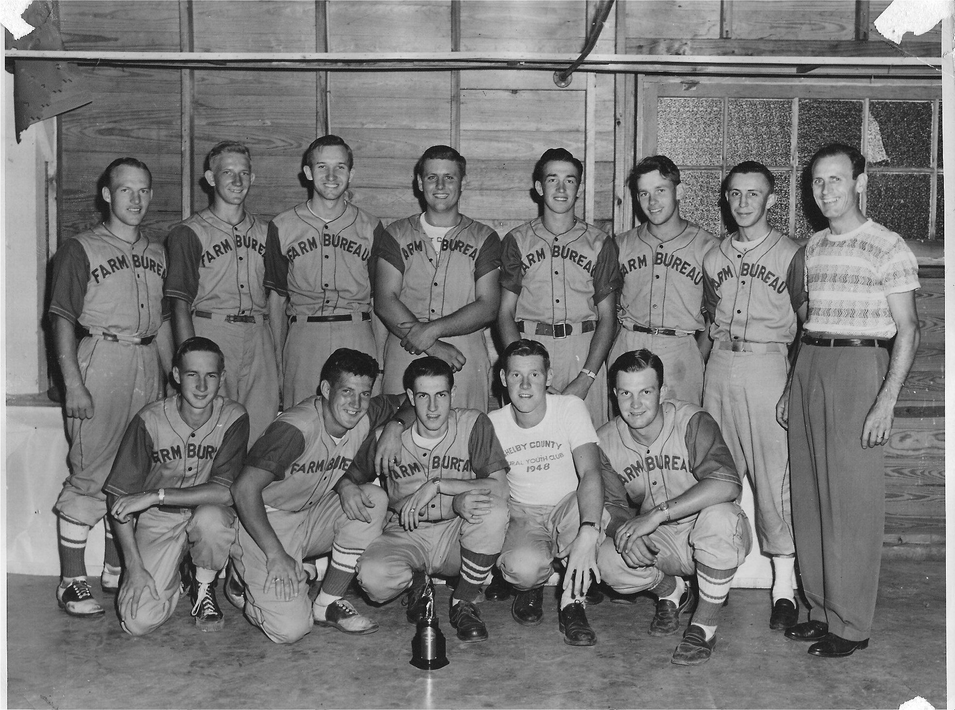 Black and white glossy photographic print in landscape format. Narrow band of white on all edges and evidence of adhesive tape on the four corners. Image is of a group of 13 men posed for the camera. All but two of them are wearing baseball uniforms with Farm Bureau on the front. One man in front row is wearing a white t-shirt that says "Shelby County Rural Youth Club 1948"