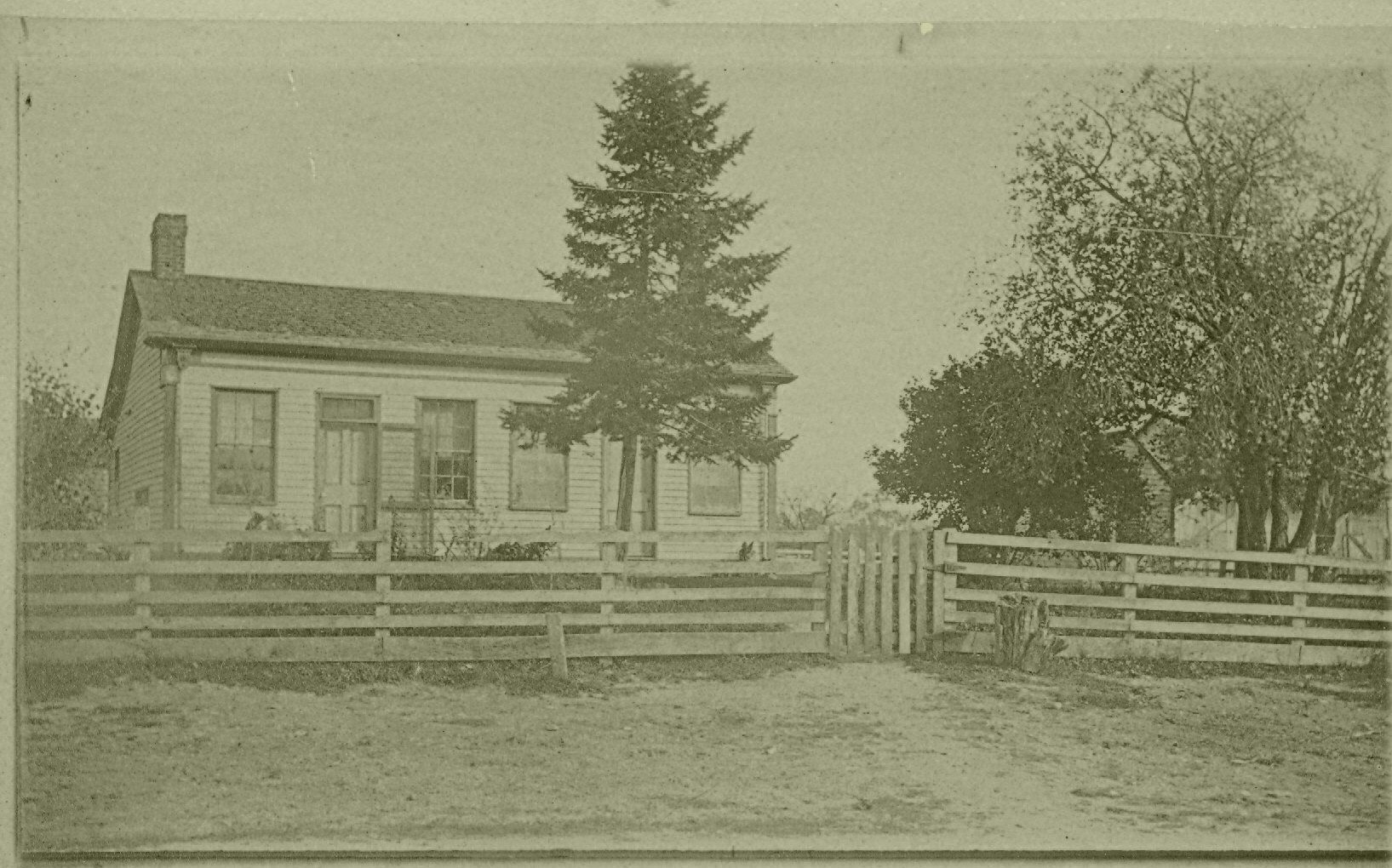Black and white photographic print on pasteboard mount; exterior view of farmstead; board fence in foreground; behind that is small frame house, single-story; has 4 double-hung sash windows and 2 doors on front; one door appears to open right and the other opens left; door on left side has screen door standing open; brick chimney on left and possibly another on right behind cedar tree; parts of other buildings on right visible through foilage.Collection