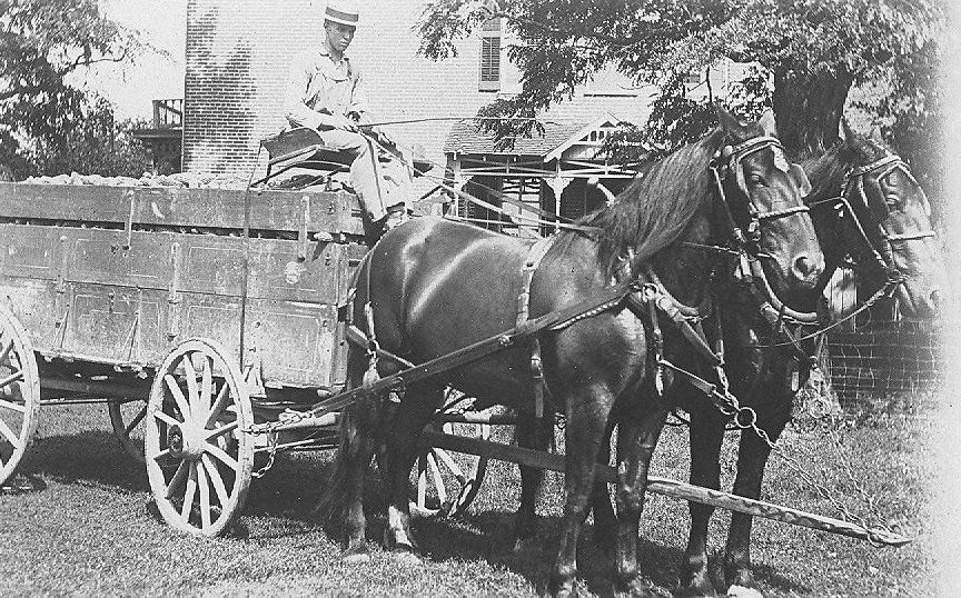 Black and white glossy photographic print of a farmer sitting on the seat of a large grain wagon that is hitched to two horses. Wagon is filled with ear corn. Large tree behind horse's heads, large brick building behind the tree. 2 coppies of this photoCollection