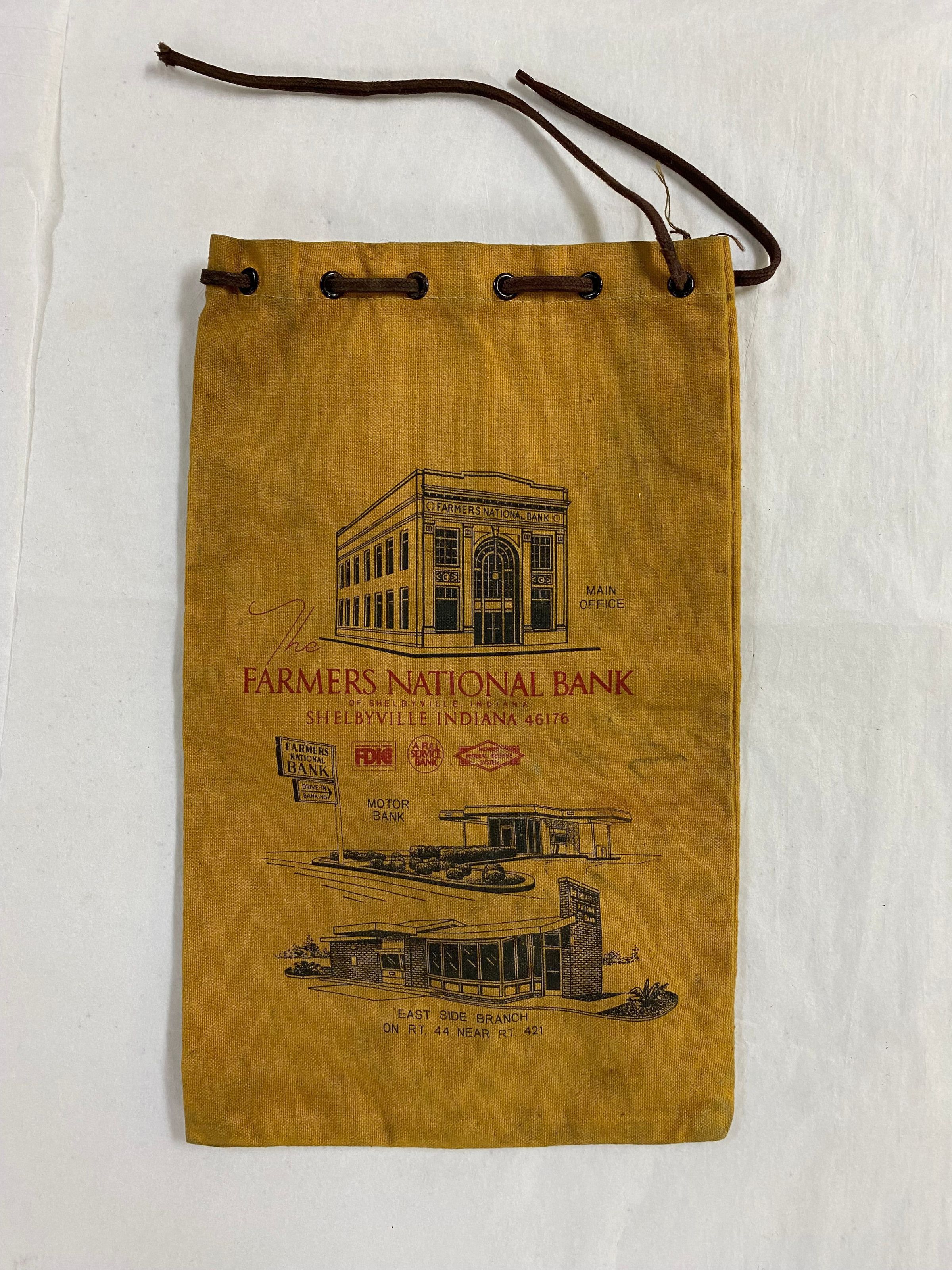 Gold color drawstring bag printed in red and black; pictures main office Farmers National Bank/ Shelbyville, Ind. Motor Bank & East Side Branch/ on Rt 44 Near Rt 421; twelve islets at top with brown shoe lace for draw string; seamed on 1 side and bottom.Collection