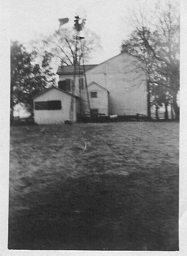 Black & white snapshot; subject out of focus farmstead; visible side of salt box house with an ell extension; gable end of house facing camera, lacks windows; also visible 2 outbuildings and a windmill.