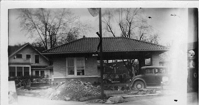 Donation, 07/26/2005. Black and white glossy photographic snapshot print in landscape format. On back in ink: "Filling/station building-/just half way turned/around-on its way/to its new foundation./Apr/1937/N. E. Cor of/Harrison &/Mechanic Sts/Snapshot by Jess.E.Meloy."Collection