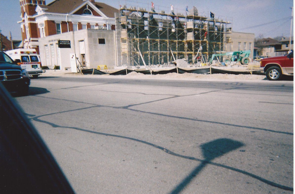 Photograph shows the walls being contructed for the new fire station # 1. Background shows Grover Museum and the former High School building.Collection