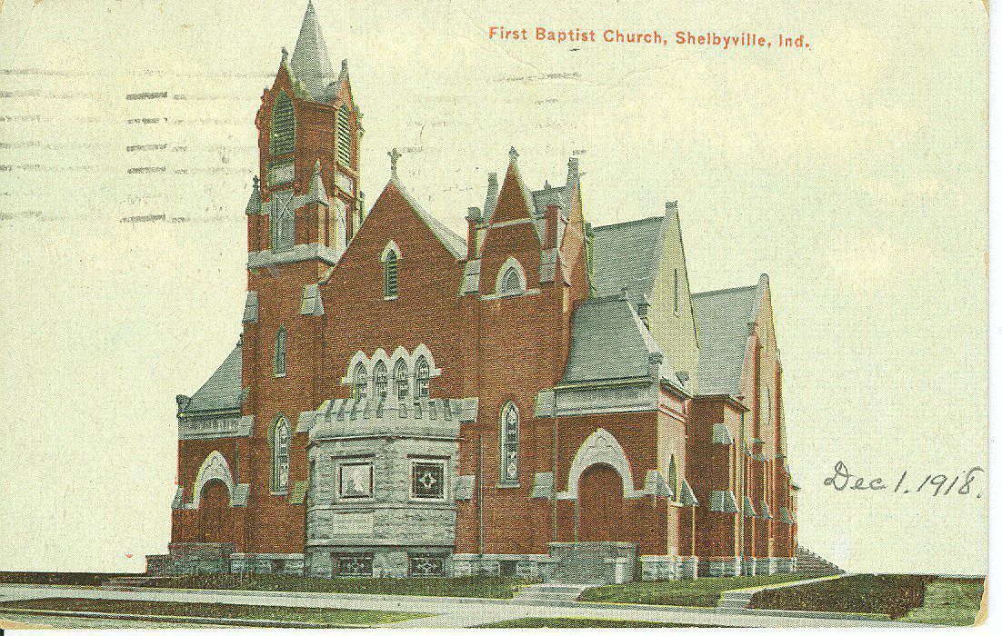 3.5" x 5.5" color postcard in landscape format. Image shows the First Baptist Church set against a white background. A hand written correspondence is written in ink on the back.Collection