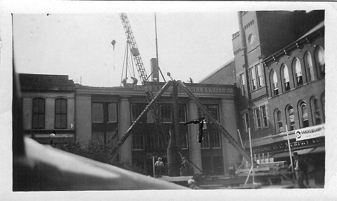 On back in ink: "Oct-Nov. 1938/Dismantling the/Bedford stone front of/the 1st Nat Bank building/by Shelby Construction Co./Clyde F. Yates/Engineer/ Snapshot by Jess.E.Meloy."Collection
