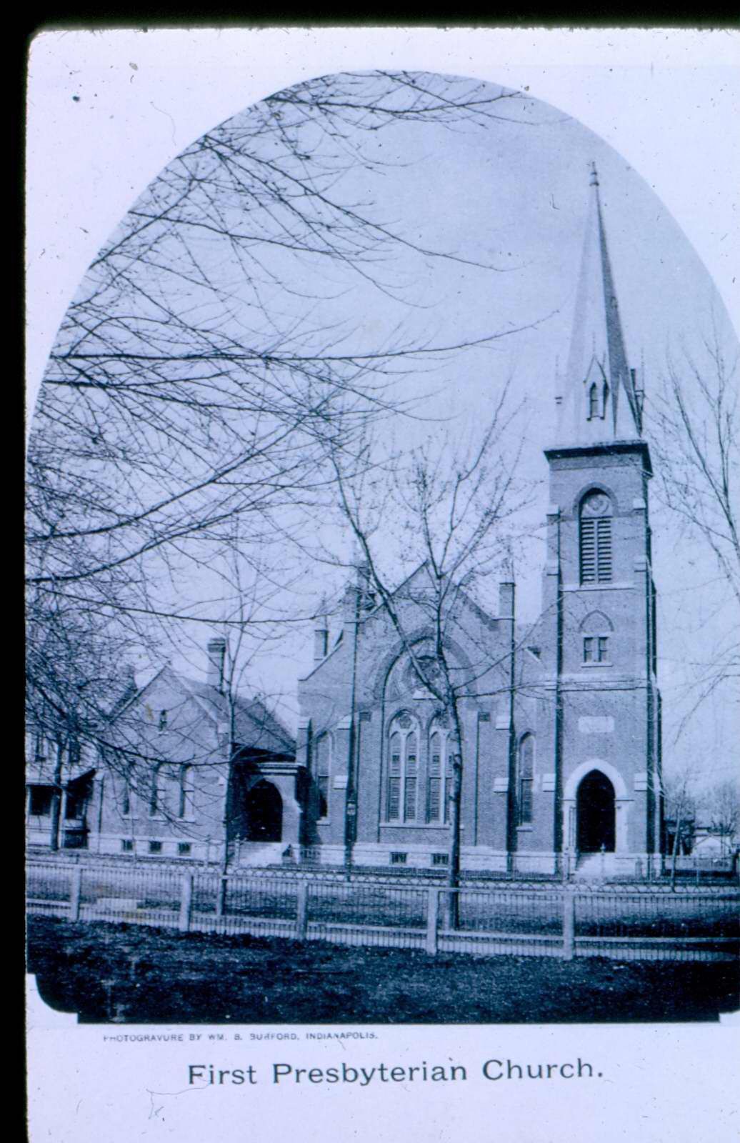 Black and white photographic slide in portrait format. Slide frame is marked: "First Presbyterian/Church 1892/W. Broad." Caption on image: First Presbyterian Church."Collection