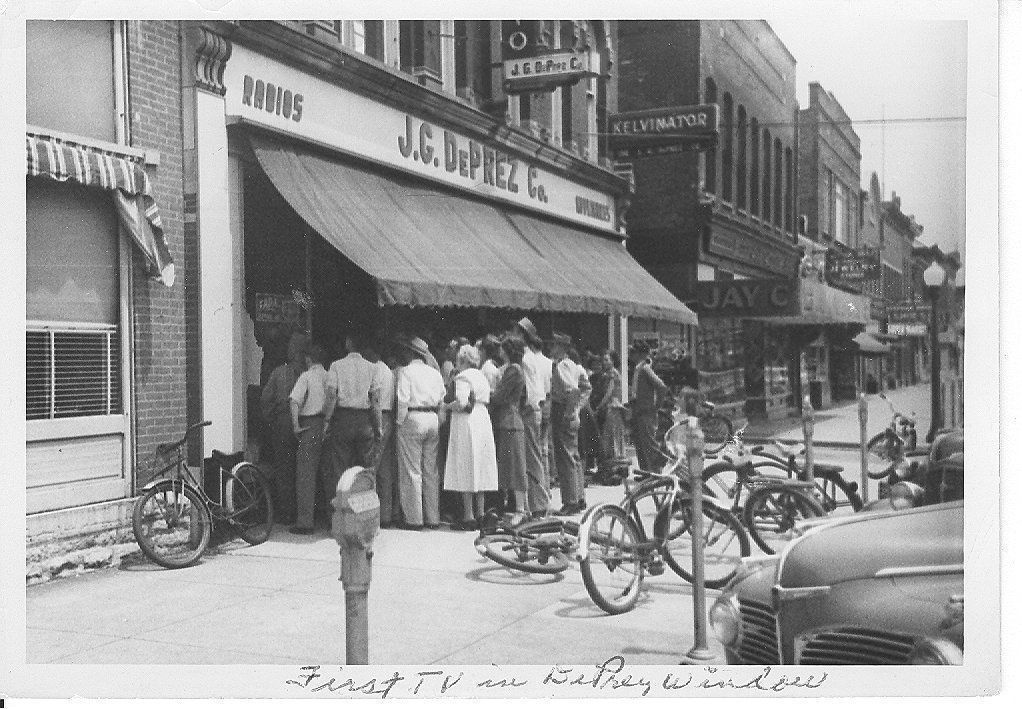 3.5" x 5" balck and white glossy photo in landscape format. Image shows a crowd of people standing outside the display window at J.G. DePrez department store. Hand written caption at the bottom of the picture says "First TV in DePrez window." Several bicycles are visible on the street at the right of the photo, as well as the front end of a car.Collection