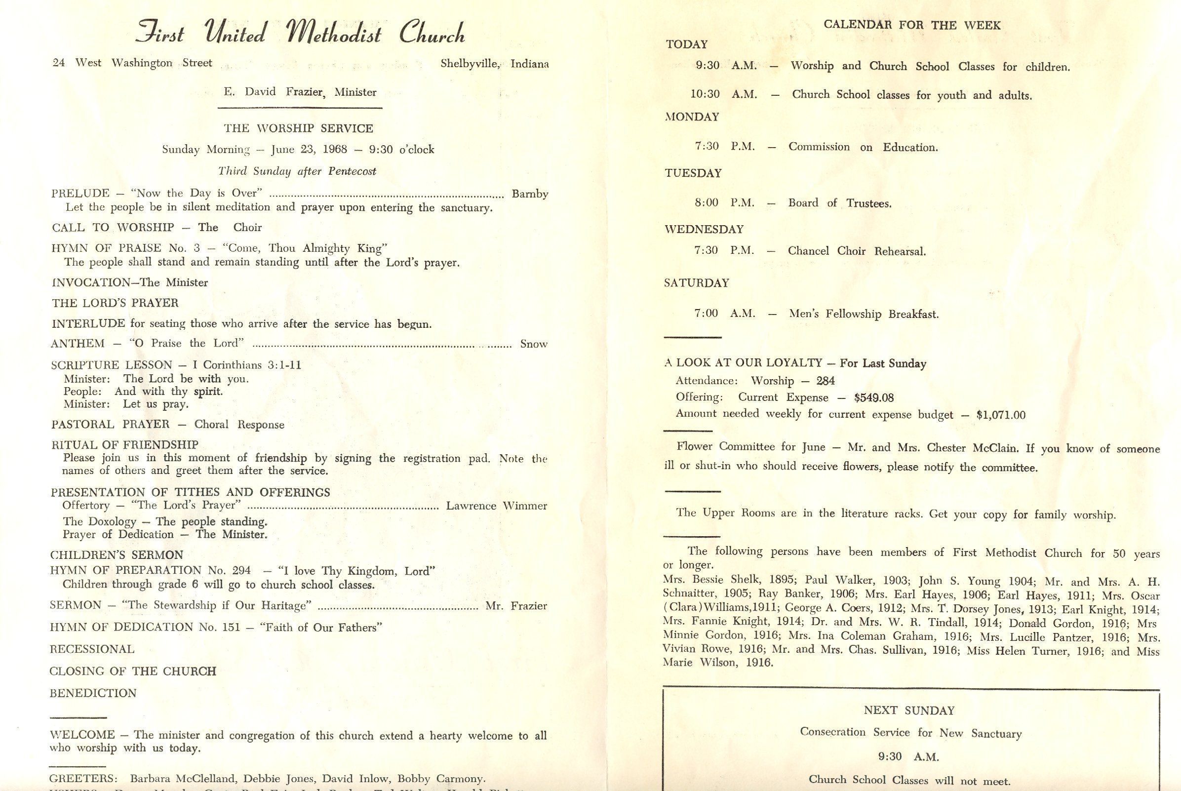 A weekly Bulletin/Program of the First United Methodist Church. This publication was for the week of June 23, 1968