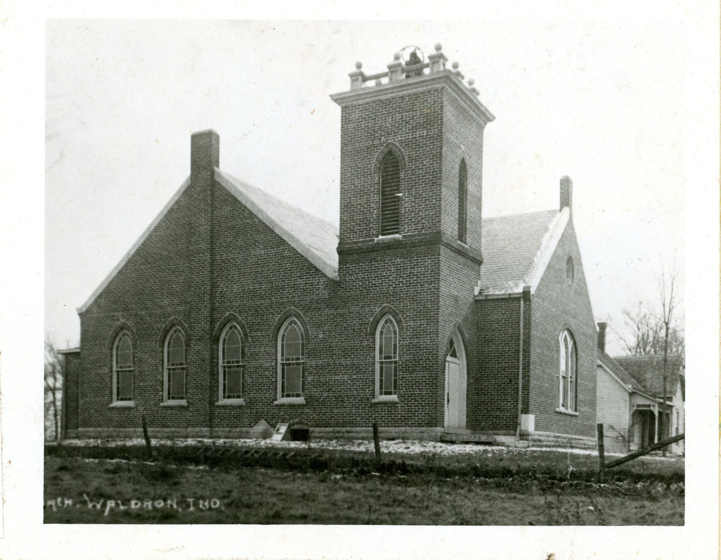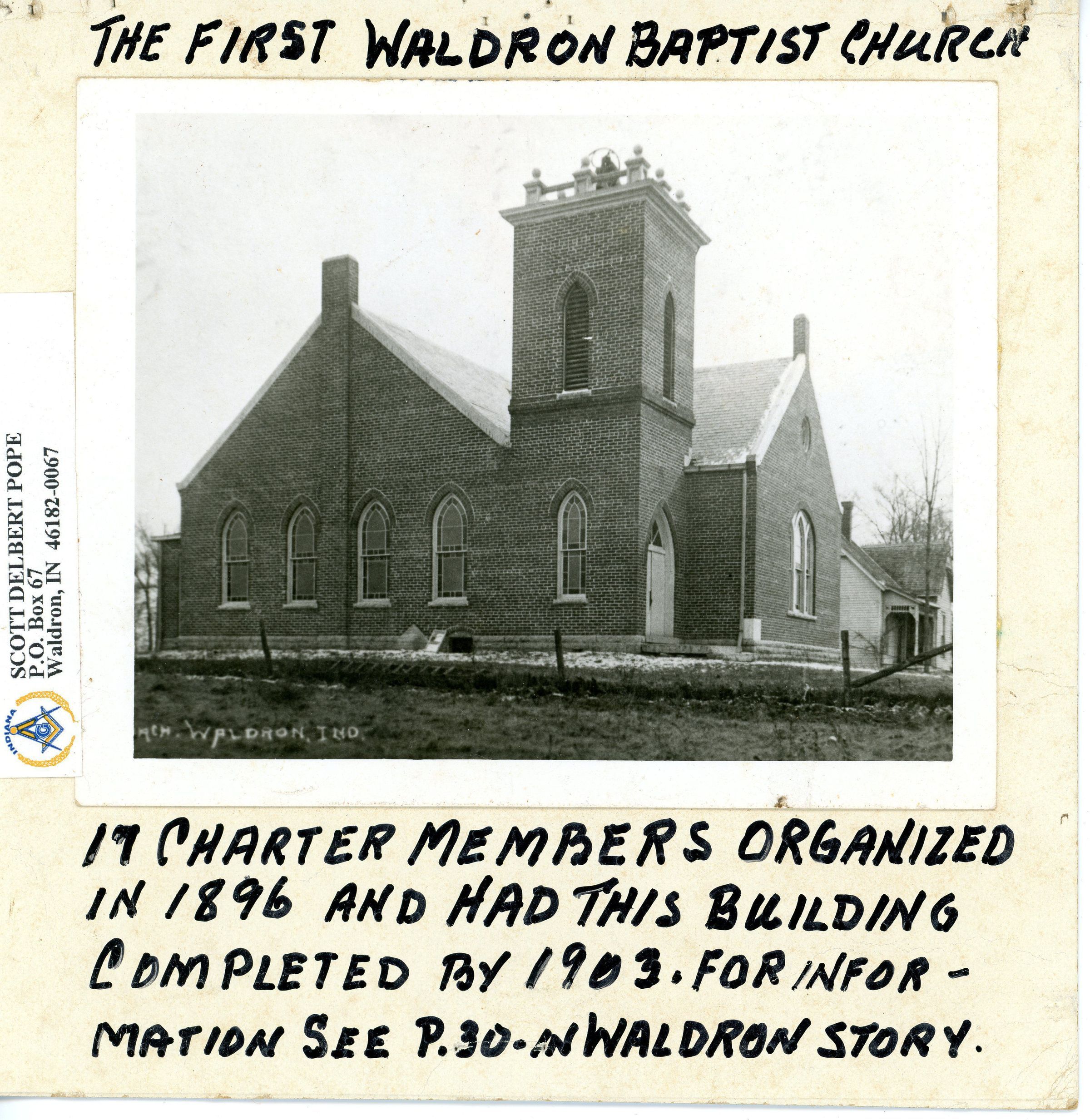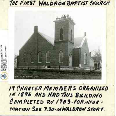 THE FIRST WALDRON BAPTIST CHURCH / 17 CHARTER MEMBERS ORGANIZED / IN 1896 AND HAD THIS BUILDING COMPLETED BY 1903. FOR INFOR-/ MATION SEE P.30 IN WALDRON STORY.Language