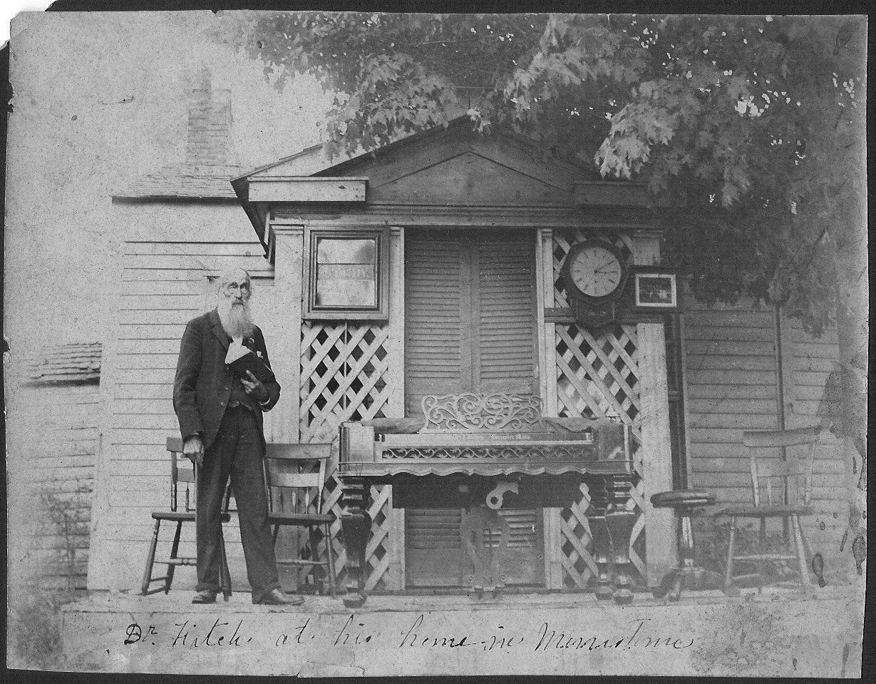 Black and white photographic print on gray cardboard mount. Image is of a slender old man on left end of porch, wearing dark 3-piece suit, has long white beard, holding a book in left hand. To his left is a melodeon, a piano stool and a wood chair. Behind his legs are two wood chairs. Also visible on porch, hanging on lattice work behind melodeon, is a framed object that appears to read "STUDY", also a school-style clock and a framed photograph. Between lattice work is a shuttered door. House is clapboard-sided with a wood shingle roof and has elements of Greek Revival; upper right corner of print dominated by summer foliage of a tree. Inscribed in ink across bottom front of image is: "Dr. Fitch at his home in Morristown". Inscribed in ink on back of mount: "Dr. Oscar F. Fitch as he appeared (?)/at one of the school reunions/using the same melodeon, clock and/study card that he had used in his/school room when I attended his school/Florence Rock." Donation, 03/12/1987. Used by Florence Rock. ****See 87.17.1 for information on Dr. Fitch.Collection