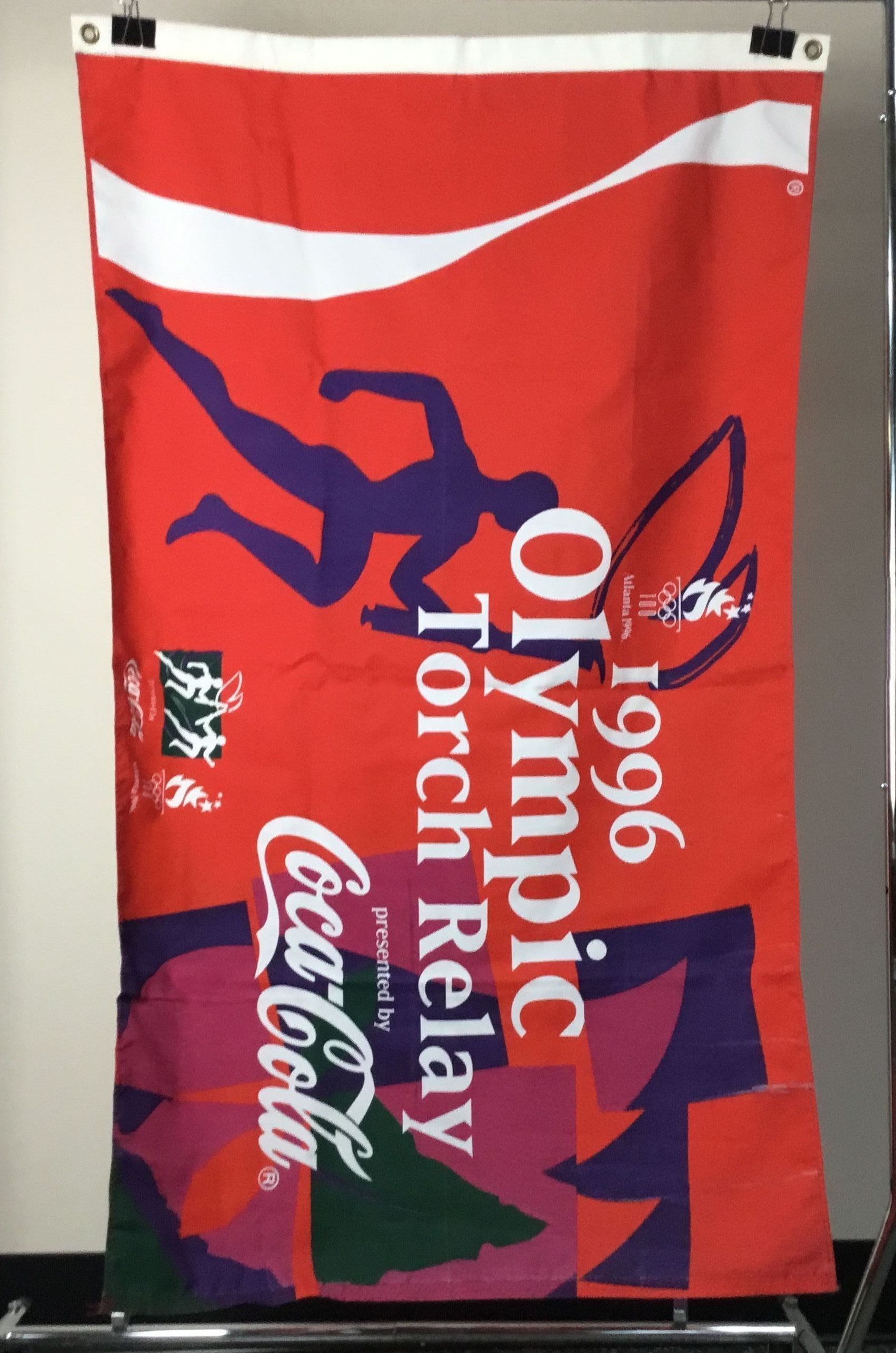 Red flag from Olympic Torch Relay for 1996 Atlanta Games. Blue figure w/ torch, Coca-Cola advertising. Relay came thru Shelbyville, IN.Use