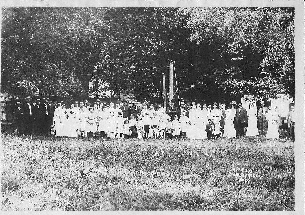Black and white photographic print of a large group of people in an outdooor setting; appears to be 68 people in the picture; wide open grassy field in front of them and large trees to rear; also behind the group are two large poles which have ropes attached to them but too much is hidden to identify purpose; also appear to be some structures in the back ground. Lower right corner of print is marked with white letters reading: "M.P.C. CO/Shelbyville, Ind." Bottom center is marked: "Scene at Flat Rock Cave". Wide margin on left end of print is inscribed in ink: "Trustees Picnic". Donation, 08/14/1982. See "Notes"Collection