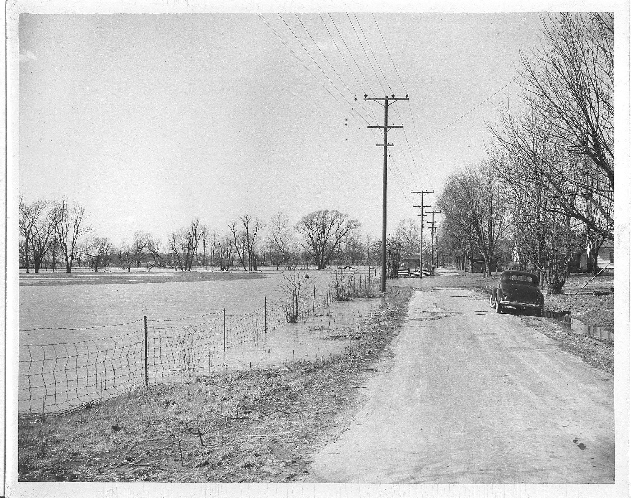 8" x 10" Black and white glossy photo in landscape format. Image shows the Flat Rock River during a flood stage. This image shows a dirt road to the right with a car parked, and a barbed-wire fence in the center of the photo. The river has flooded to the edge of the road and across the road at one point.Collection