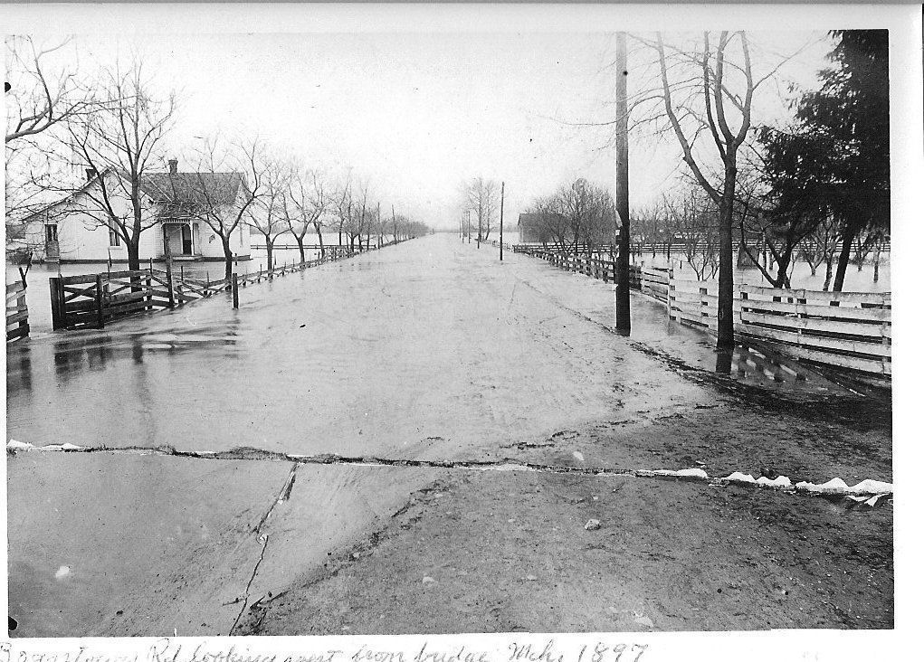 Donation, 07/26/2005. Black and white glossy photographic print in landscape format. This is a copy of .138A. Written in blue ink across the bottom of the photo: "Boggstown Rd. looking west from bridge Mch 1897." On back of photo in ink: "1967/note house on right-old Cossairt Home-site where Latshaws lived./Note also bent tree in front of house-tree still there."Collection