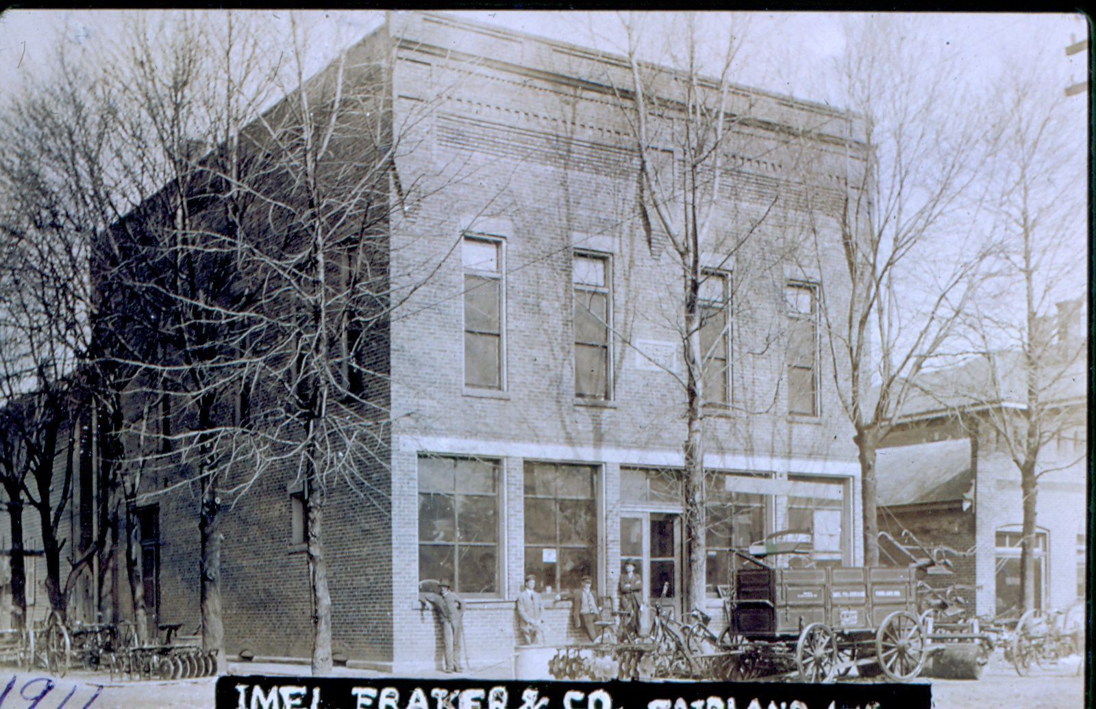 Black and white photographic slide in landscape format. Slide frame is marked: "Emil Fraker & Co./1911/Fairland, Ind."Collection