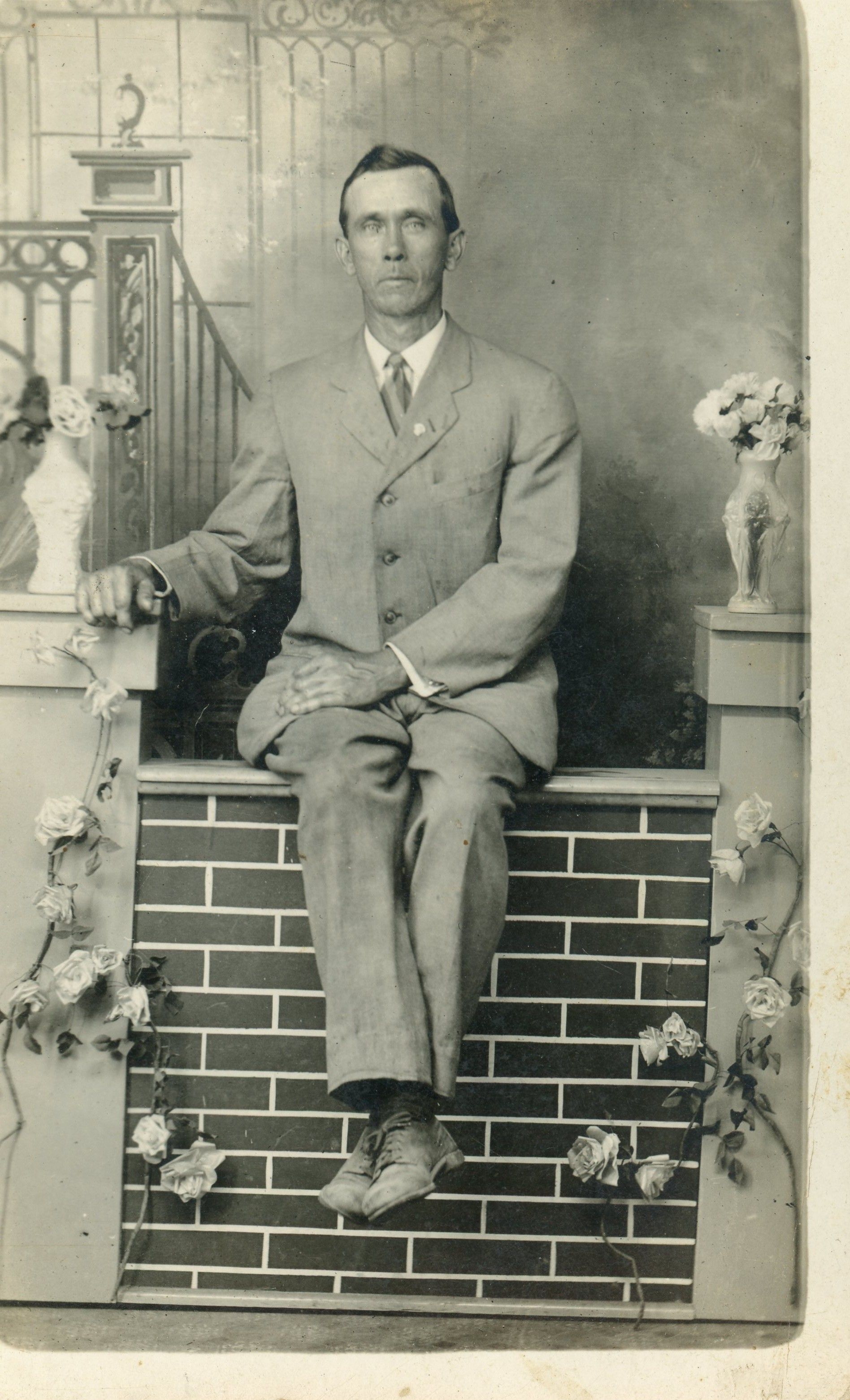 Photo of Frank Applegate, Hattie Riddle's Half Brother. Sitting on a fake wall in a Light Suit with Legs Crossed. Right arm resting on the wall and left arm in lap.Collection