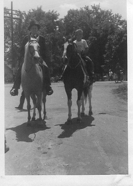 B&W photo; man and aboy on horses; ;man has on a top hat, his horse is light in color; the boy is riding a mix colored horse. There is a boy in background on a bike; and a large utility pole. picture has scalloped edgesCollection