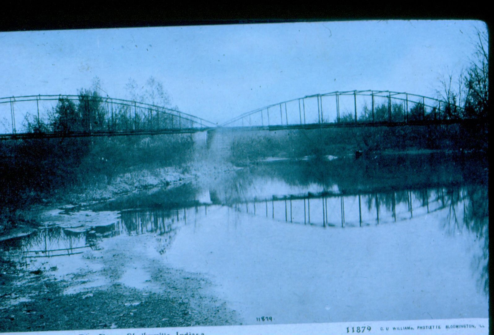 Donation, 07/26/2005. Black and white photographic slide in landscape format. This is a slide of a postcard. Slide frame is marked: "Franklin Road Bridge/over Blue River." Caption under image: "Franklin Bridge, Blue River, Shelbyville, Indiana."Collection