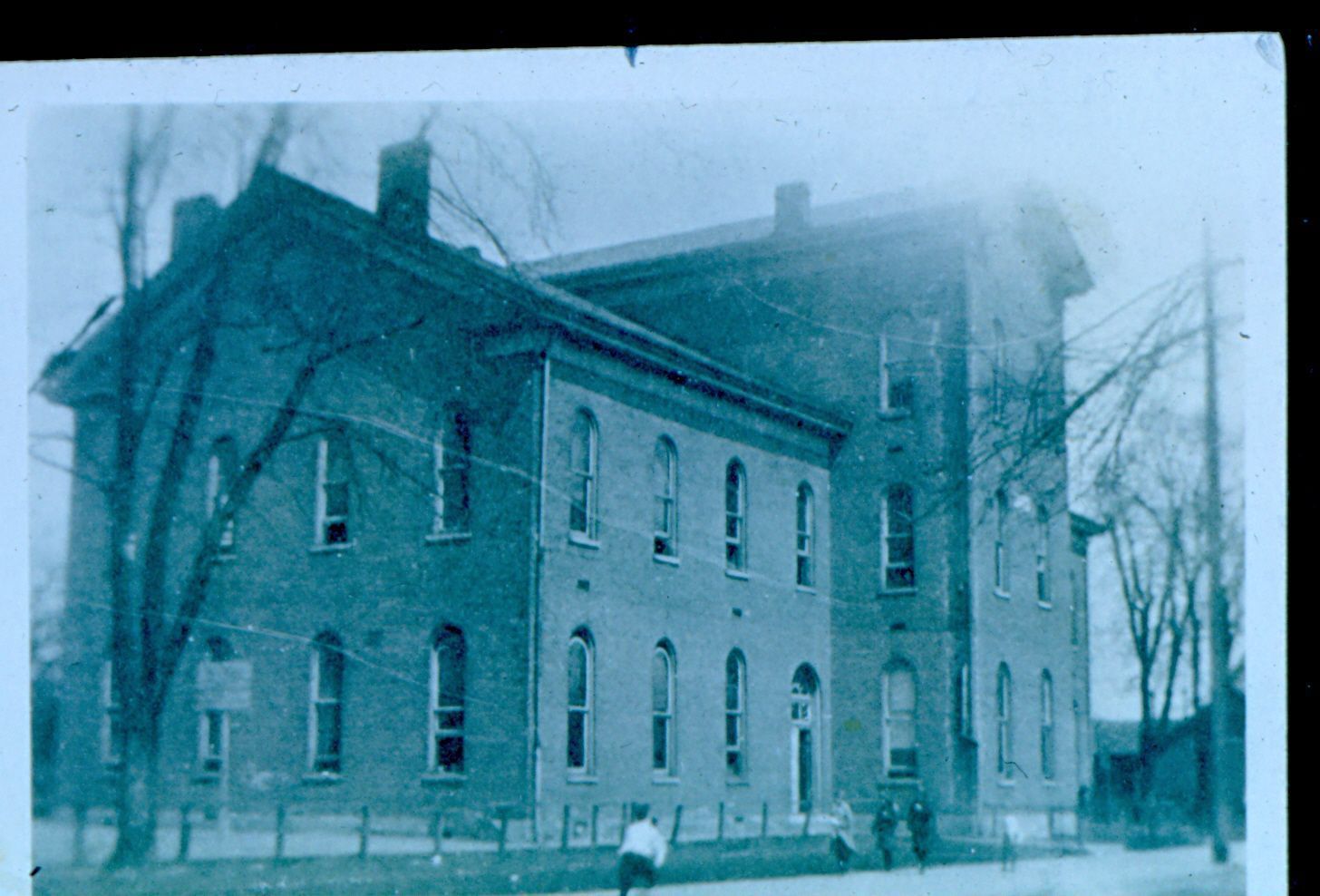 Donation, 07/26/2005. Black and white photographic slide in landscape format. Slide frame is marked: "Franklin/School Bld"Collection
