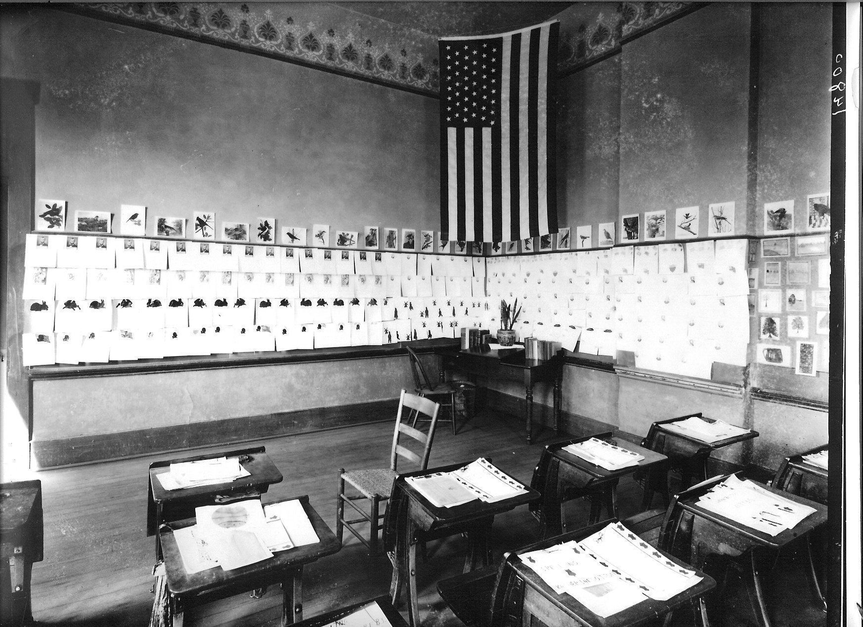 Donation, 07/26/2005. Black and white matte photographic print in landscape format. Image is of the interior of a classroom. Elaborate border at ceiling. American flag with forty-eight stars hanging in corner. Papers displayed on walls. Teacher's desk in corner under flag. Student desks in rows. "Bernard Krebs" on one desk and "Katherine Cotton" on another. On back in blue ink: "Old Franklin St. School Building-No. 1/3rd or 4th grade room/made from glass