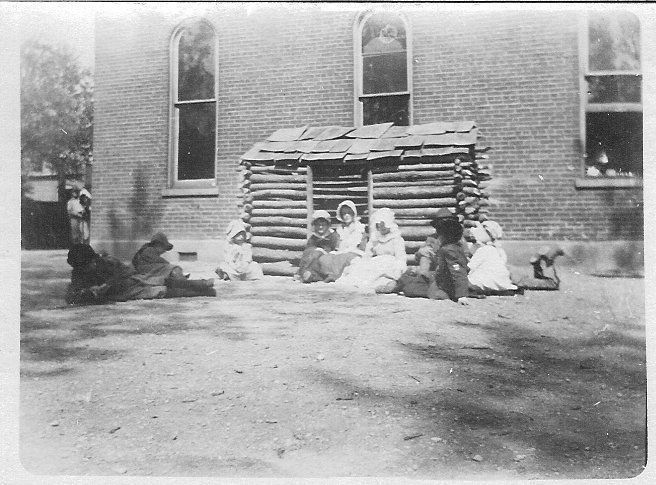 Donation, 07/26/2005. Sepia postcard in landscape format of children dressed as pioneers, sitting on ground in front of a small log cabin. In background is a large brick building with three windows. On back: "Play at old Franklin/St. School/1916"Collection