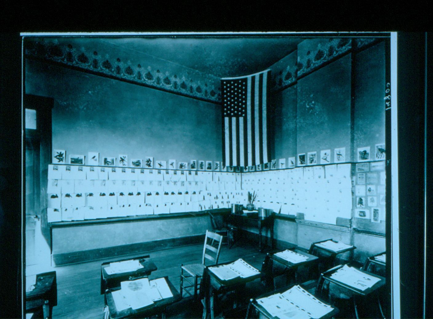 Donation, 07/26/2005. Black and white photographic slide in landscape format. This is a slide of a photograph. Slide frame is marked: "Inside 4th grade room/