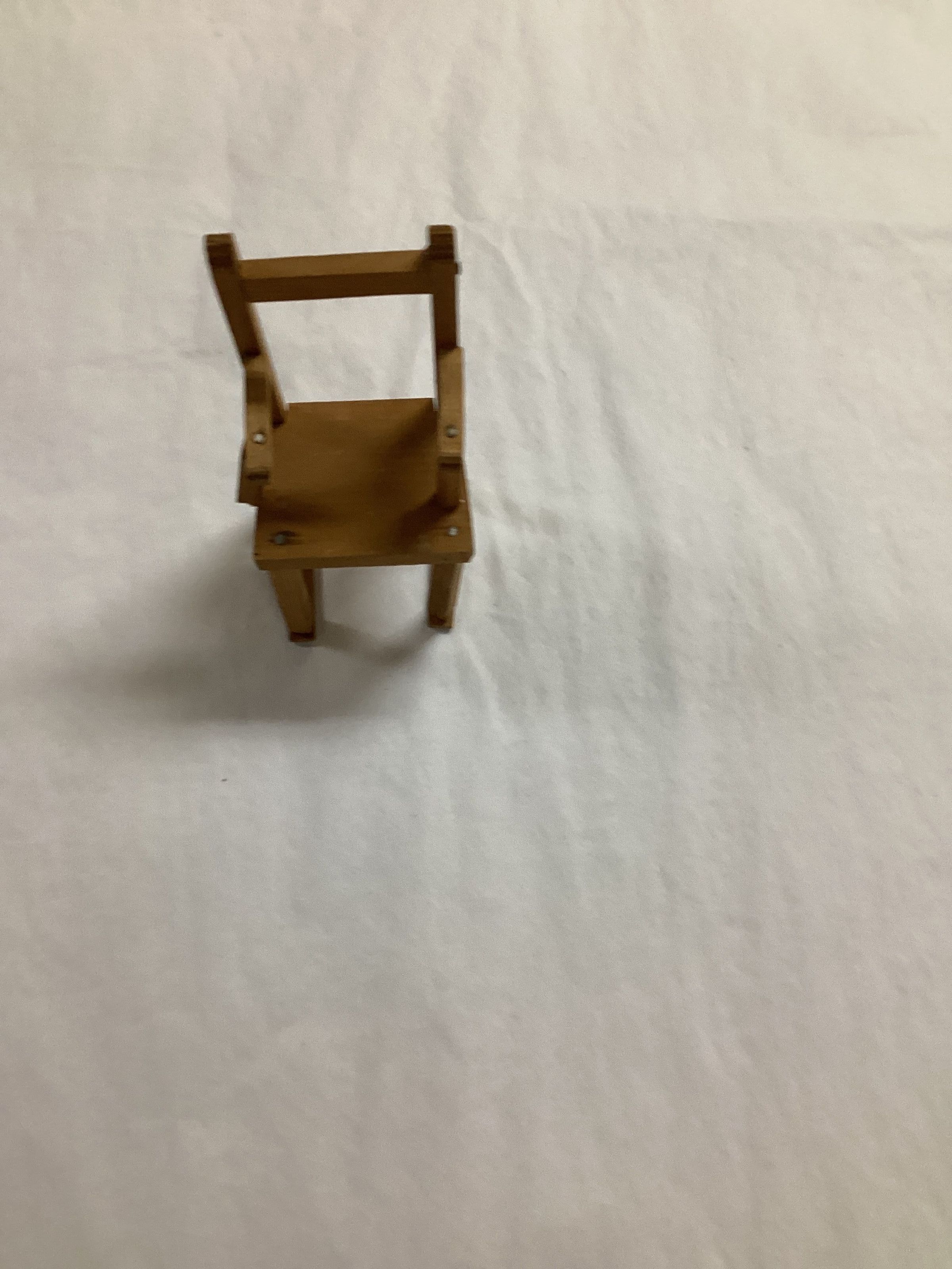 Handmade doll size chair; made of unfinished wood; has arms which are cut to represent hand grips on the end; top of the back uprighs are slightly tapered and the uprights are joined by a single stretcher at the top; back and front legs have a runner between them attached at the bottom instead of stretchers; pieces are joined together with small nails and glue