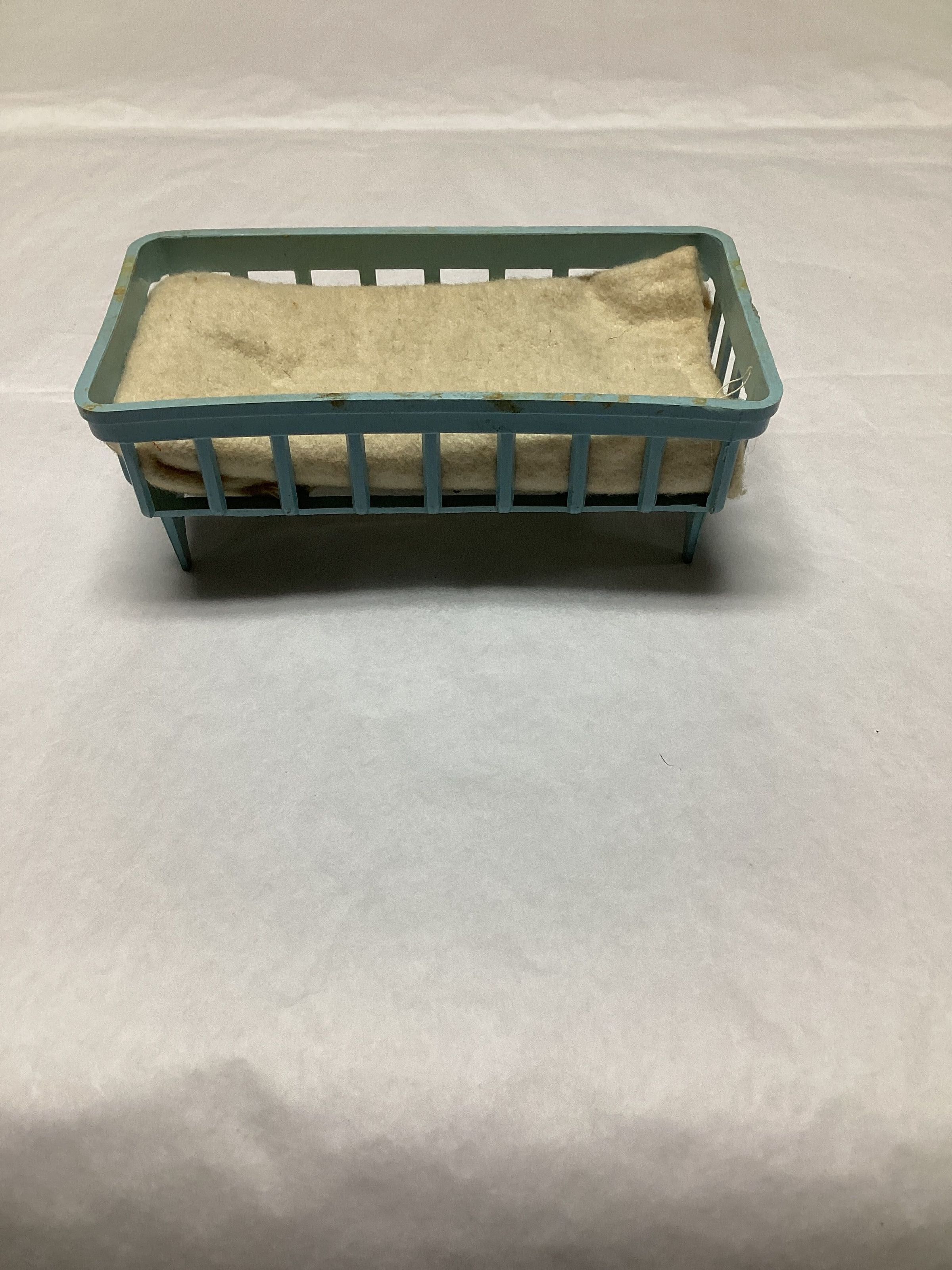 Doll furniture, youth bed; made of blue plastic; has 9 spindles on each side plus 4 on each end; 16 holes in bottom of bed; end legs are made from 1 arched has mattress and cover made of flannel material