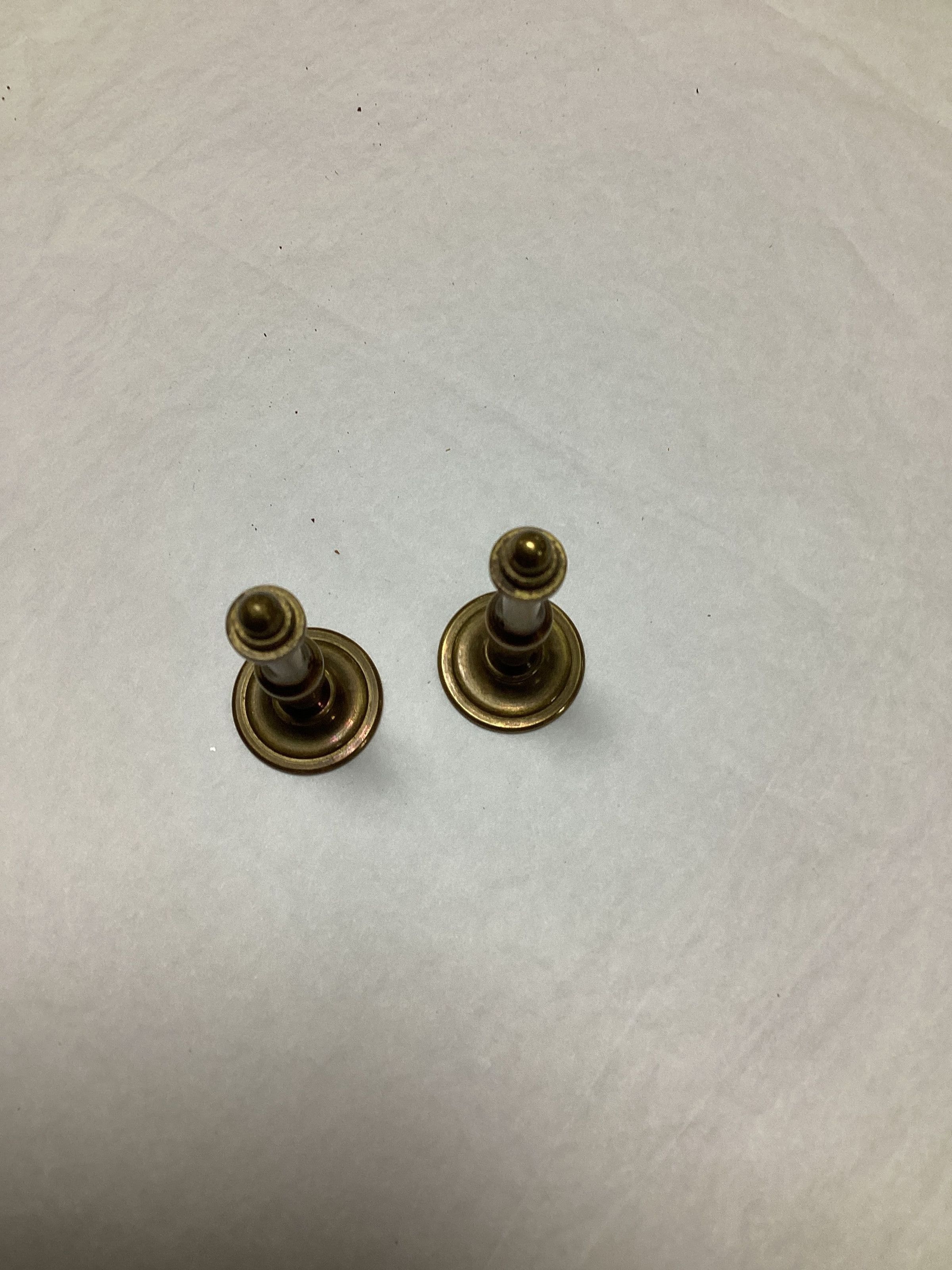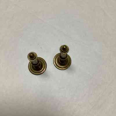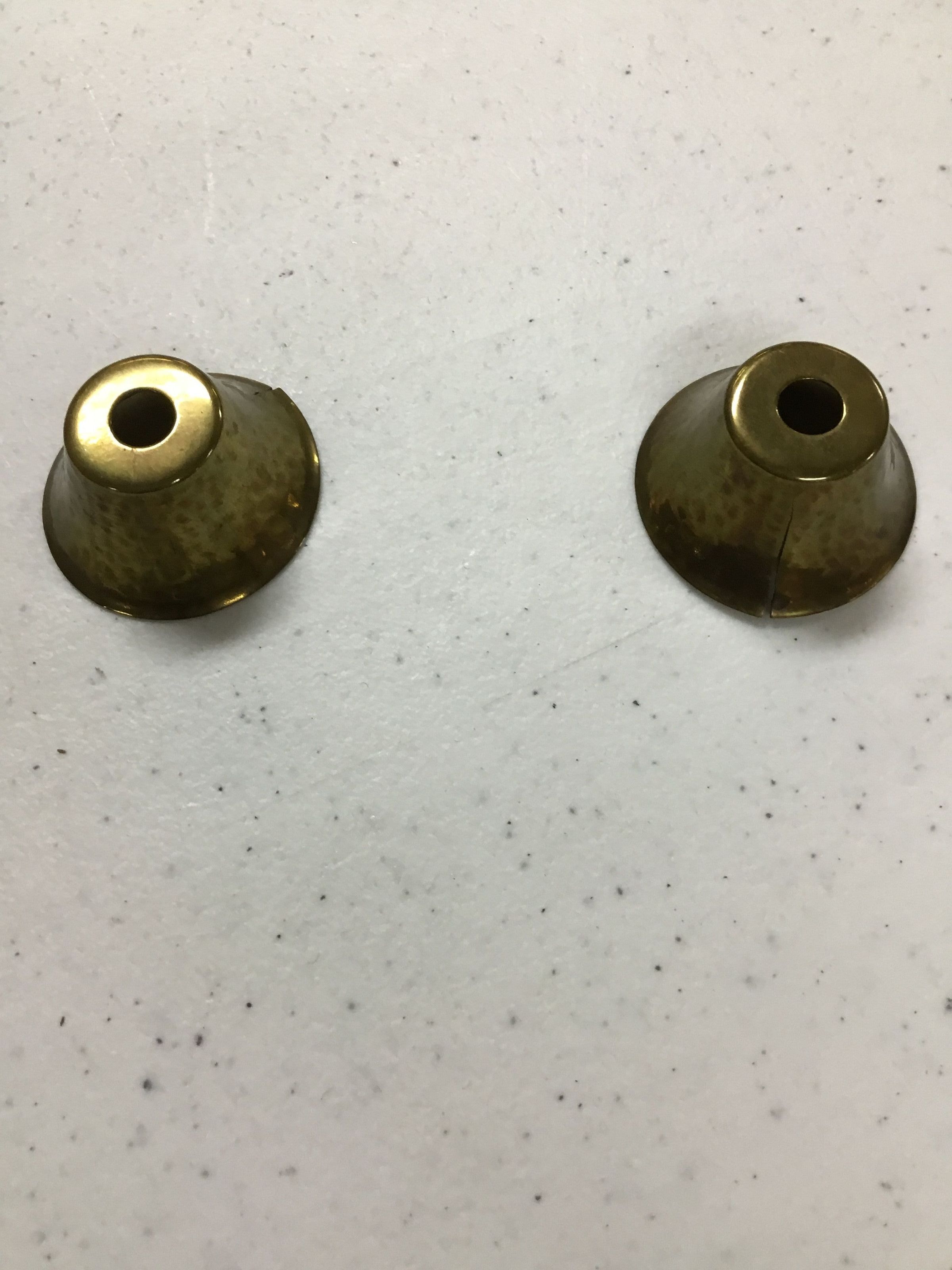 Doll Furniture; 2 brass lamps; the base and post look turned and the shades are bell shaped and have look of hammered metal; shades have a hole in top so will fit over posts