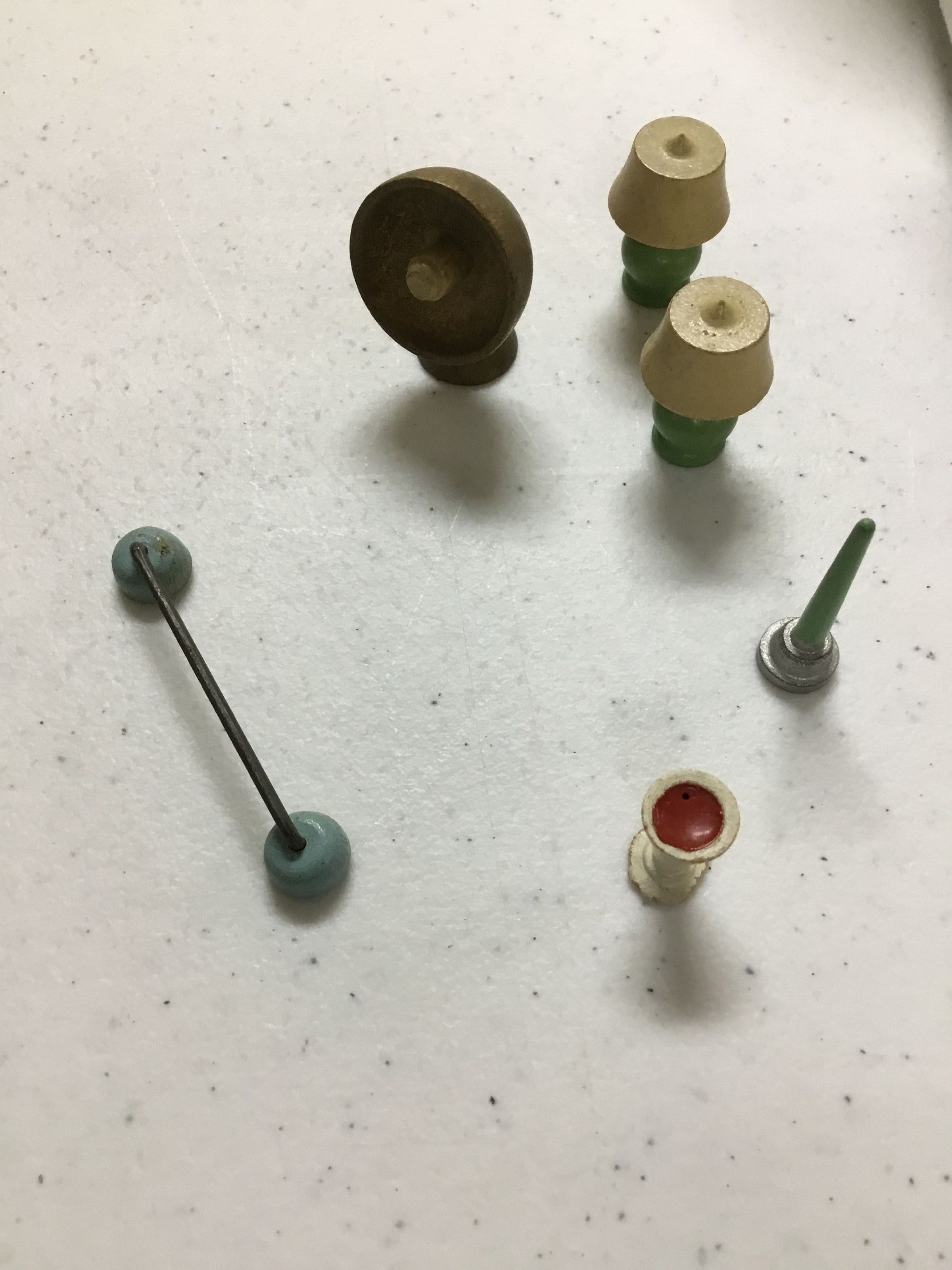 Collection of doll items too tiny to number individually; put together under one number in one envelope; consists of a pair of candlesticks with a gray base adn green candles; 1 wood bowl; 1 towel rack; pair of green lamps with ivory shades; 1 sunlamp or bathroom heater