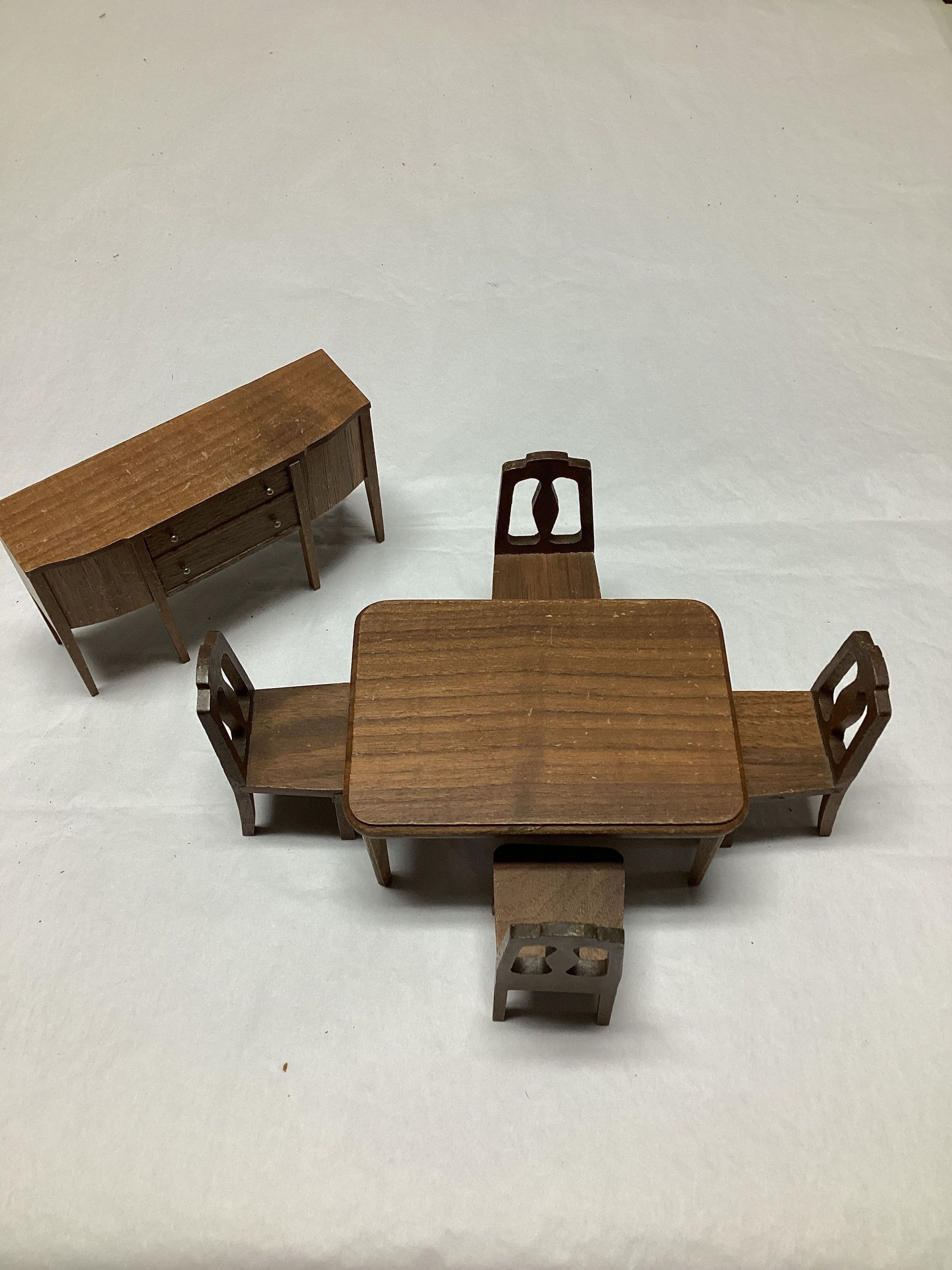 Dining room set of 6 pieces; table is 5" x 3-1/2" x 2-1/2", has 4 tapered legs on corners and 2 in center; 4 chairs are 3-3/8" high, center of back is cut out and curves at top; buffet is 3-1/4" high x 5-1/2", front panel divided in 3 sections, , tapered leg at each corner plus 2 tapered legs at front center, 2 drawers with 2 pulls, top drawer functions and inside are small pieces of paper and pencils.