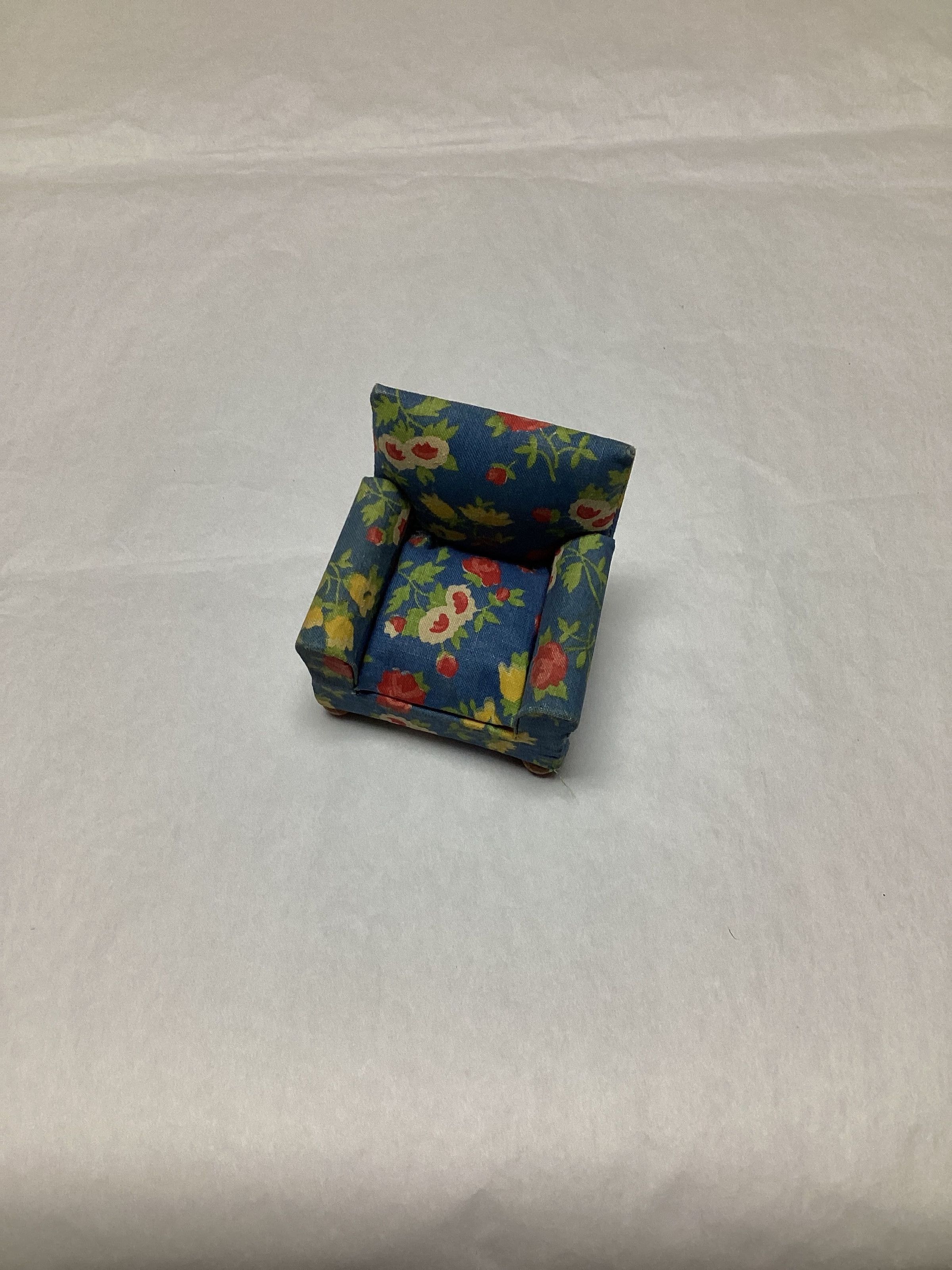 Doll furniture, overstuffed chair; made of wood and covered with a bright print of a blue background for red, yellow & white flowers and pale green leaves; has 4 wood beads for legs, stuff seat cushion is fastened at the back has rounded arms and a squared back; 2 tacks holding the back on.