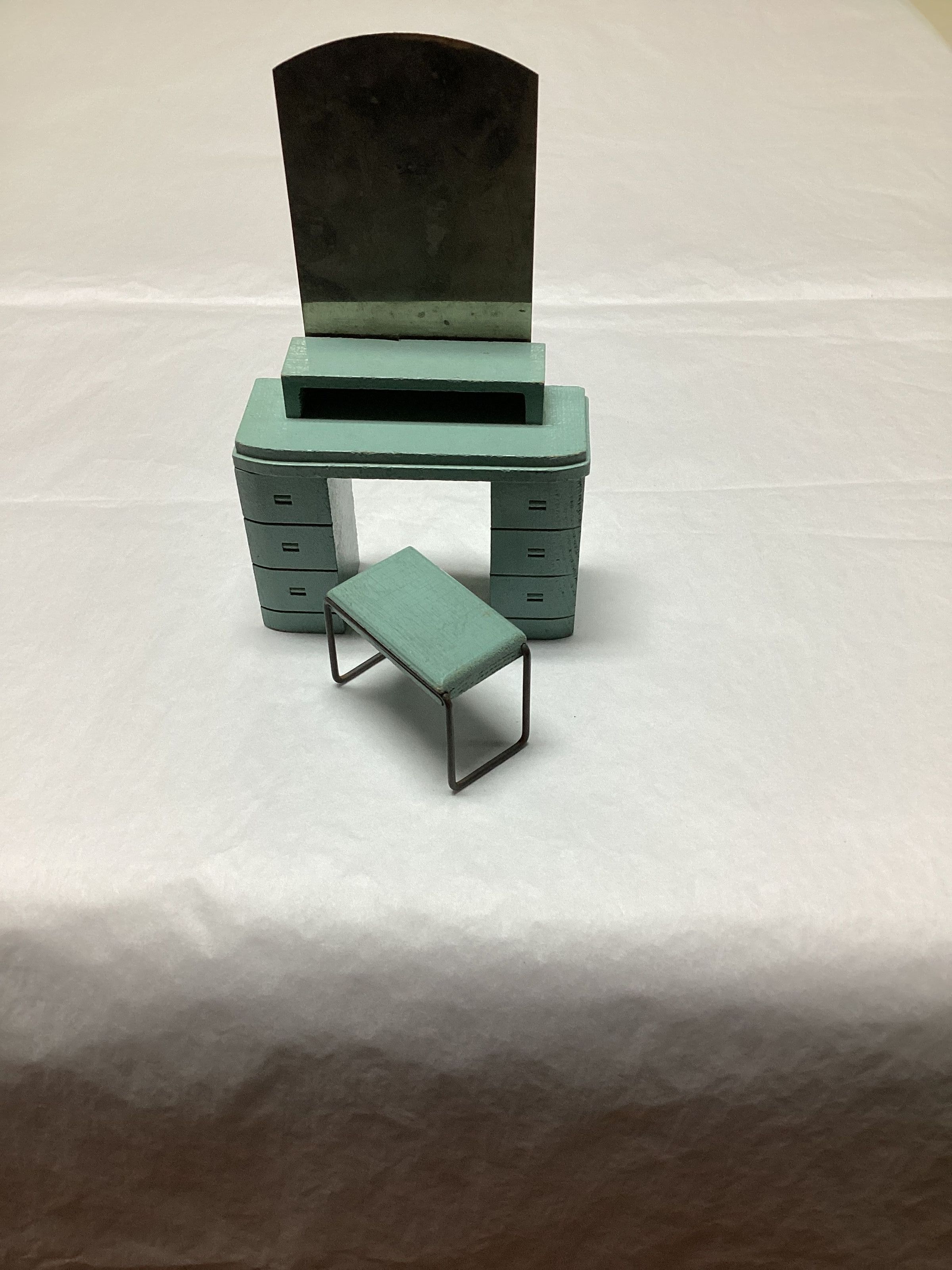 Doll furniture vanity and bench; vanity is 4" x 2" x 1" made of wood and enamel painted in aqua, simulated drawer on each side and a tin mirror and extra shelf on top; bench is 2" x 1". Enamel painted aqua and has metal rods for framing and legs.