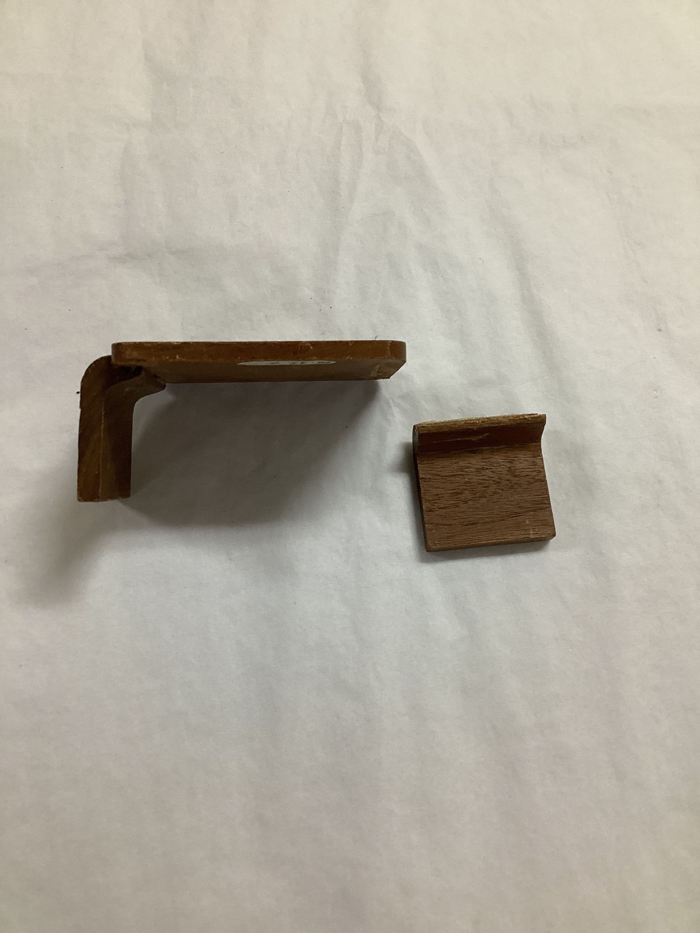 Doll Furniture; coffee table; rectangular surface with rounded corners; has 2 legs; each leg is solid wood almost as wide as coffee and been band sawed so that have a curved top. 1 leg has separated from the table.