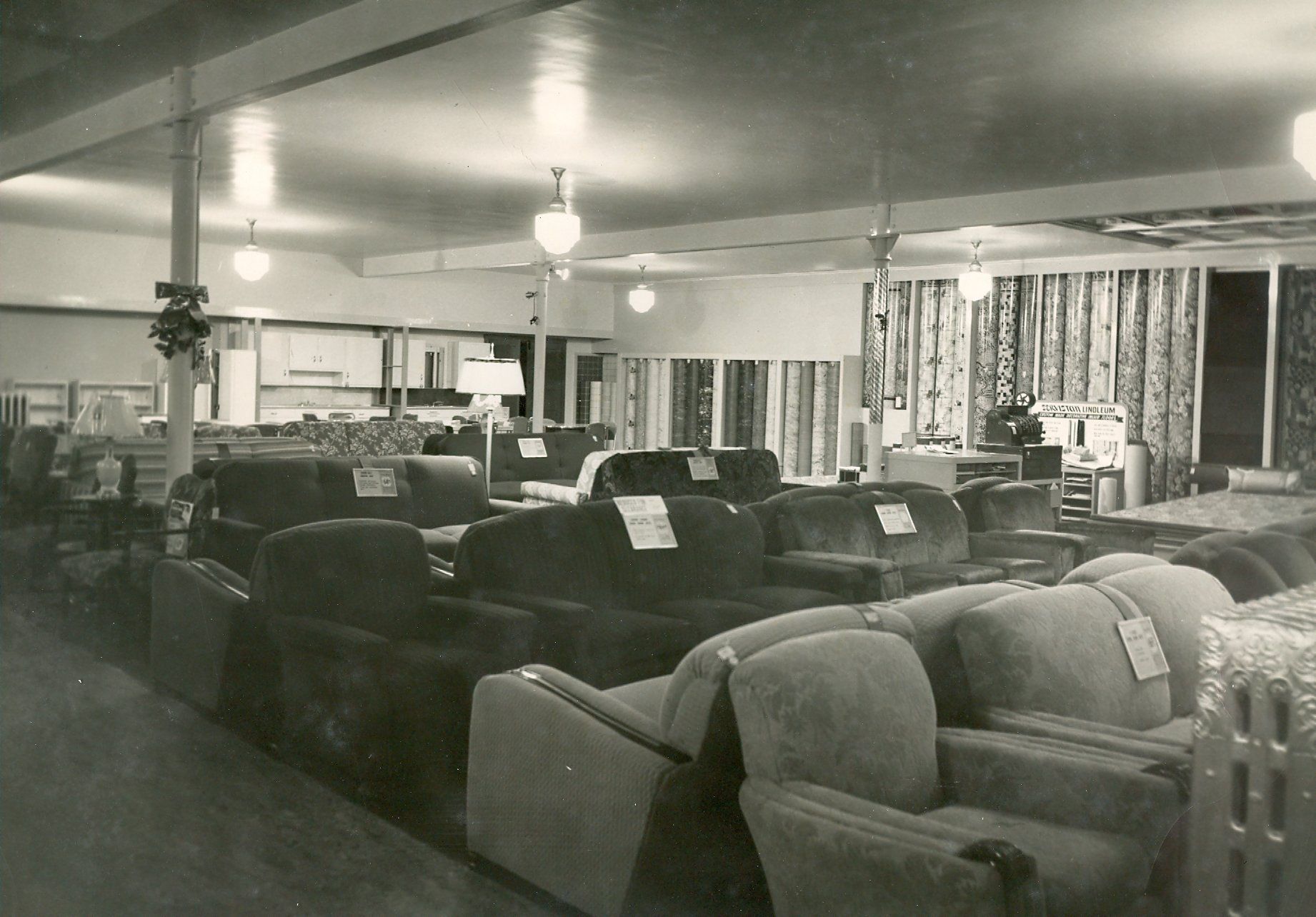 Black and white photograph of a furniture store interior display room. Photograph shows various styles recliners and sofas. Store is unidentified.Collection