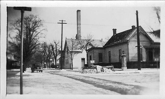 In street is a pair of sawhorses blocking access to a heap of soil. On back in black ink: "Jan-Feb./1940/Low temperatures/Broken fire hydrant/Snapshot by Jess.E.Meloy".Collection