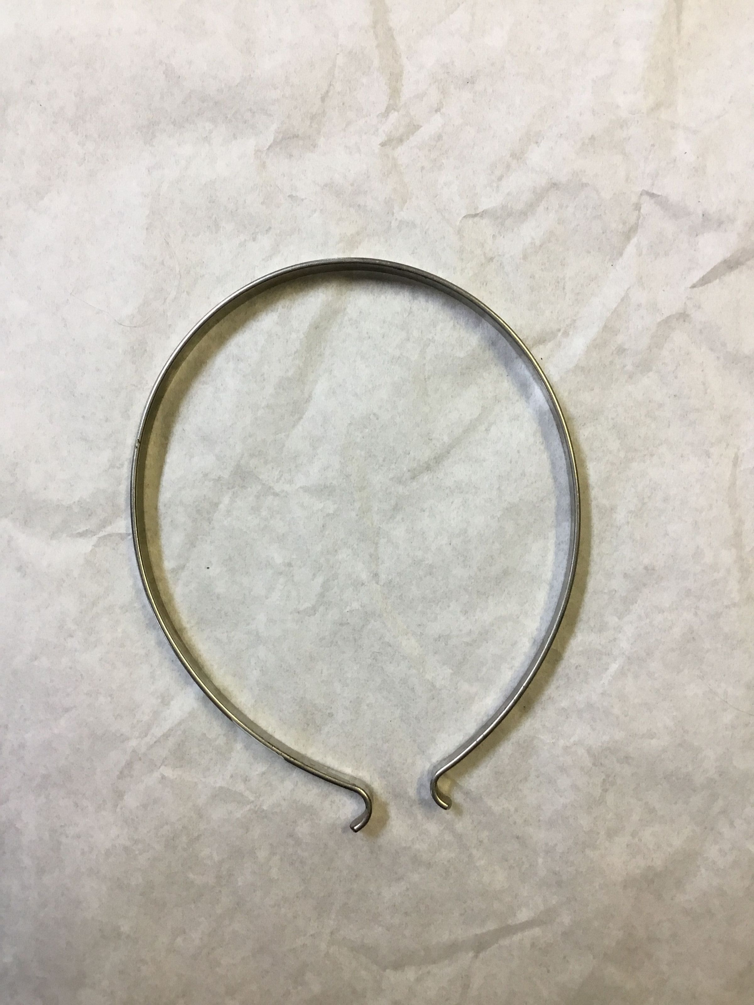Shiny metal; one piece; formed in circle; ends curved out with opening to slip over ankle; thin, bracklet like. Printed on outside - Terry's Made in England.Function was to keep pant cuff from getting caught in a bicycle chain.Collection