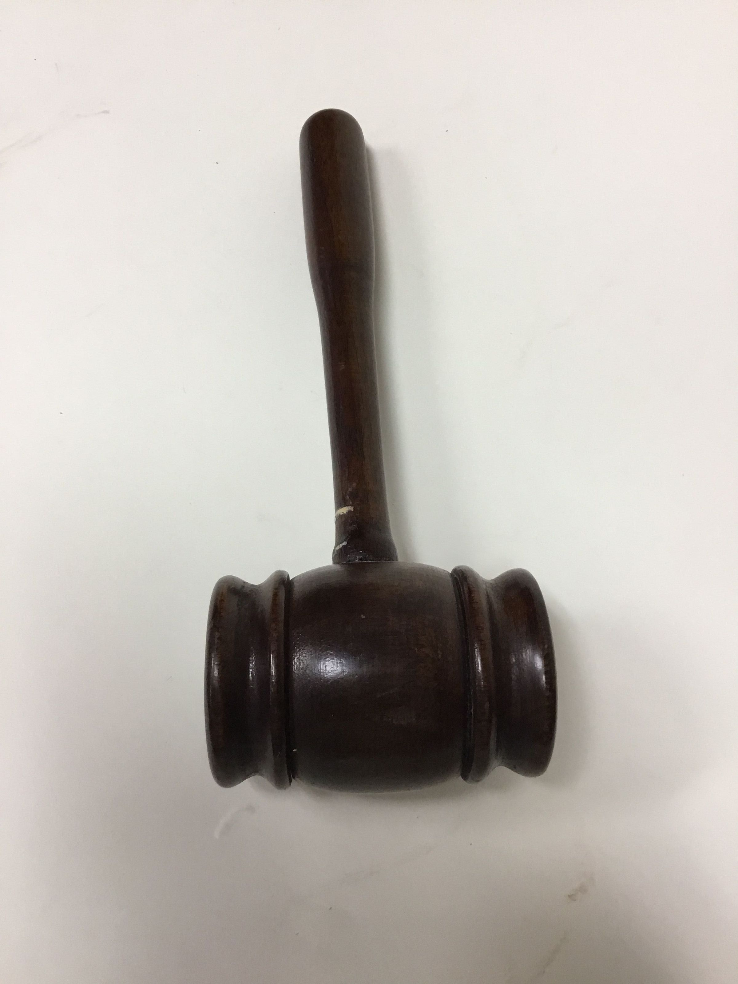 A gavel made of walnut; handle s approximately 8" long and thicker at butt than at head; the head has two flat striking faces one on each side and indentical turnings between faces; behind face there is a groove witha flairing inner edge thaen an abrupt bead followed by barrell shaped main body and pattern reverses to opposit face. Handle is smooth turned.