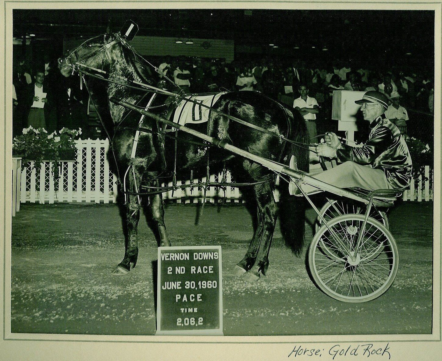 Black and white glossy photographic print in landscape format. Image is of Gold Rock in the winner's circle with Paul Hungerford at the reins. A sign at bottom center reads: "Vernon Downs/2nd Race/June 30, 1960/Pace/time 2.06.2" This image is in the right mount in a folder with 2011.024.018.