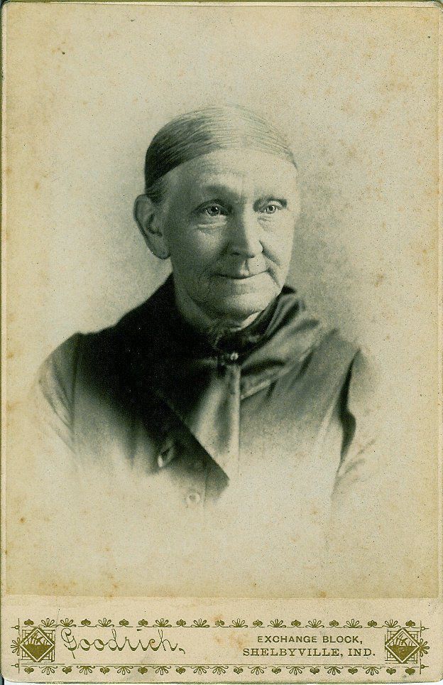 Cabinet size photo; black and whit print of an elderly woman; hair parted in middle and tightly pulled back; dark dress with high neck and buttoned front; also has a satin neck scarf fastened with a pin.