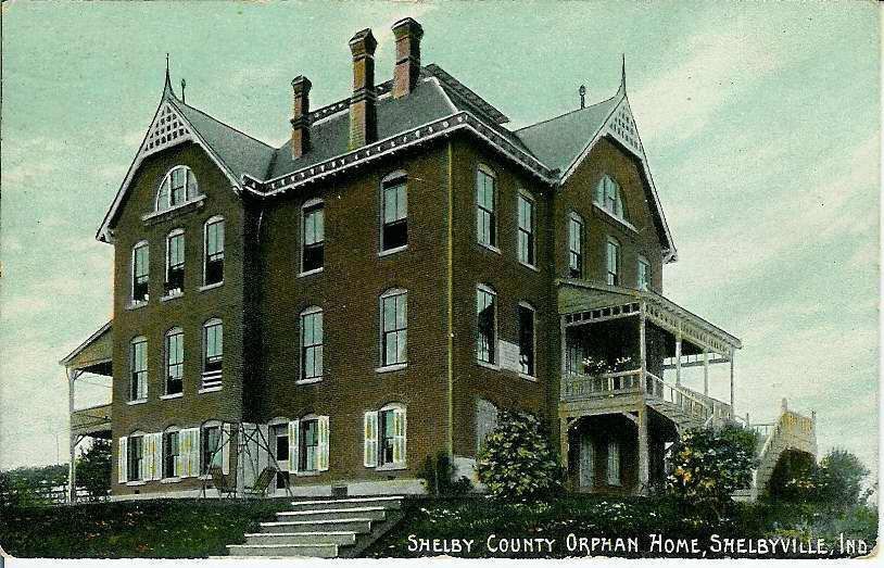 color picture postcard of large brick structure; 3 stories plus attic; eclectic architecture; there are 2 peaked gabbles and a mansard (semi) roof; 3 chimneys visible in the mansard roof section; front and back porches are two stories; lower most windows are shuttered; there is a lawn swing in the yard; lower right corner of card has white lettering: "SHELBY COUNTY ORPHAN HOME, SHELBYVILLE, IND.'Photograph Details