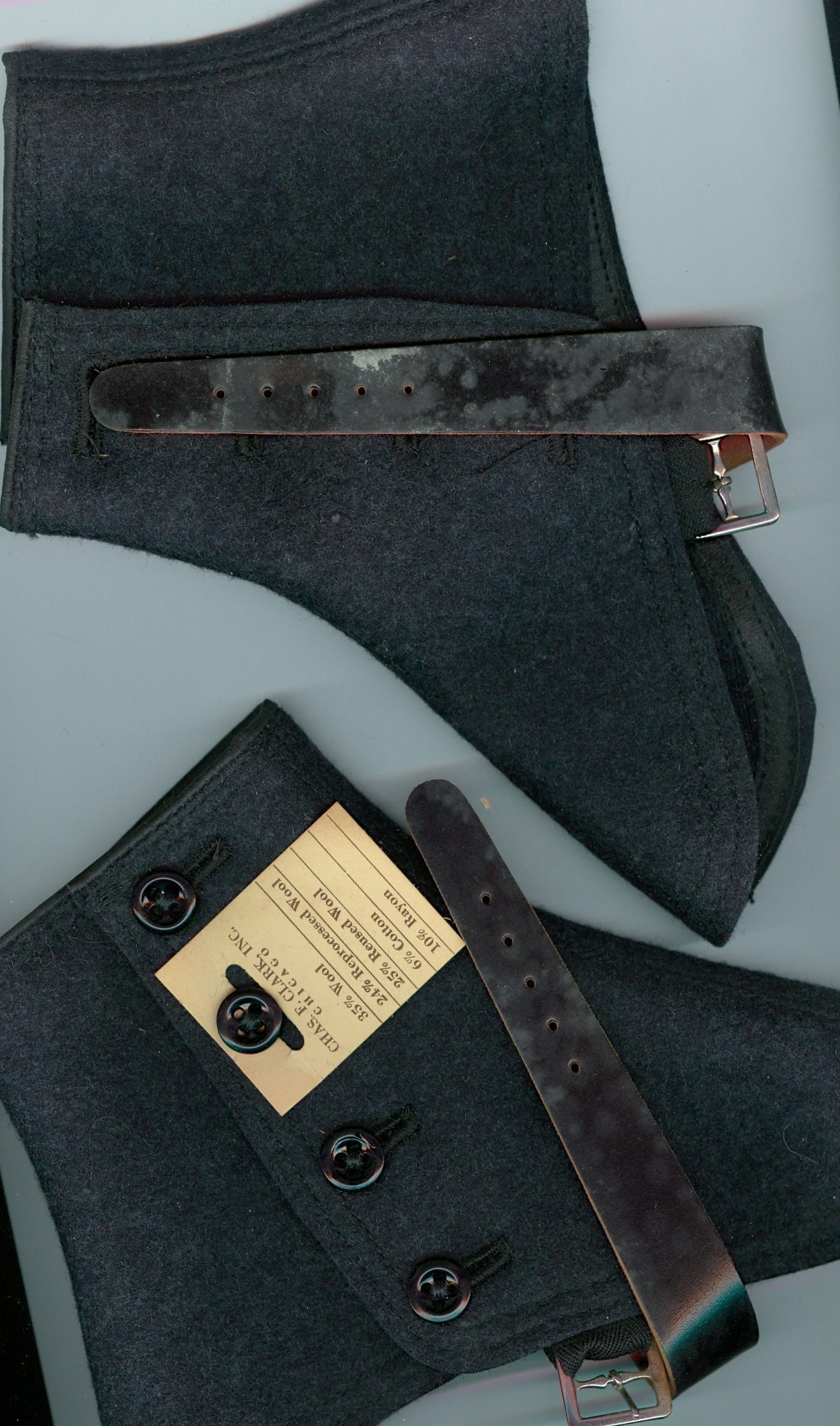 One boxed pair of spats, dark grey with 4 buttons & a strap and buckle, contained in a box with single sheet of tissue paper.