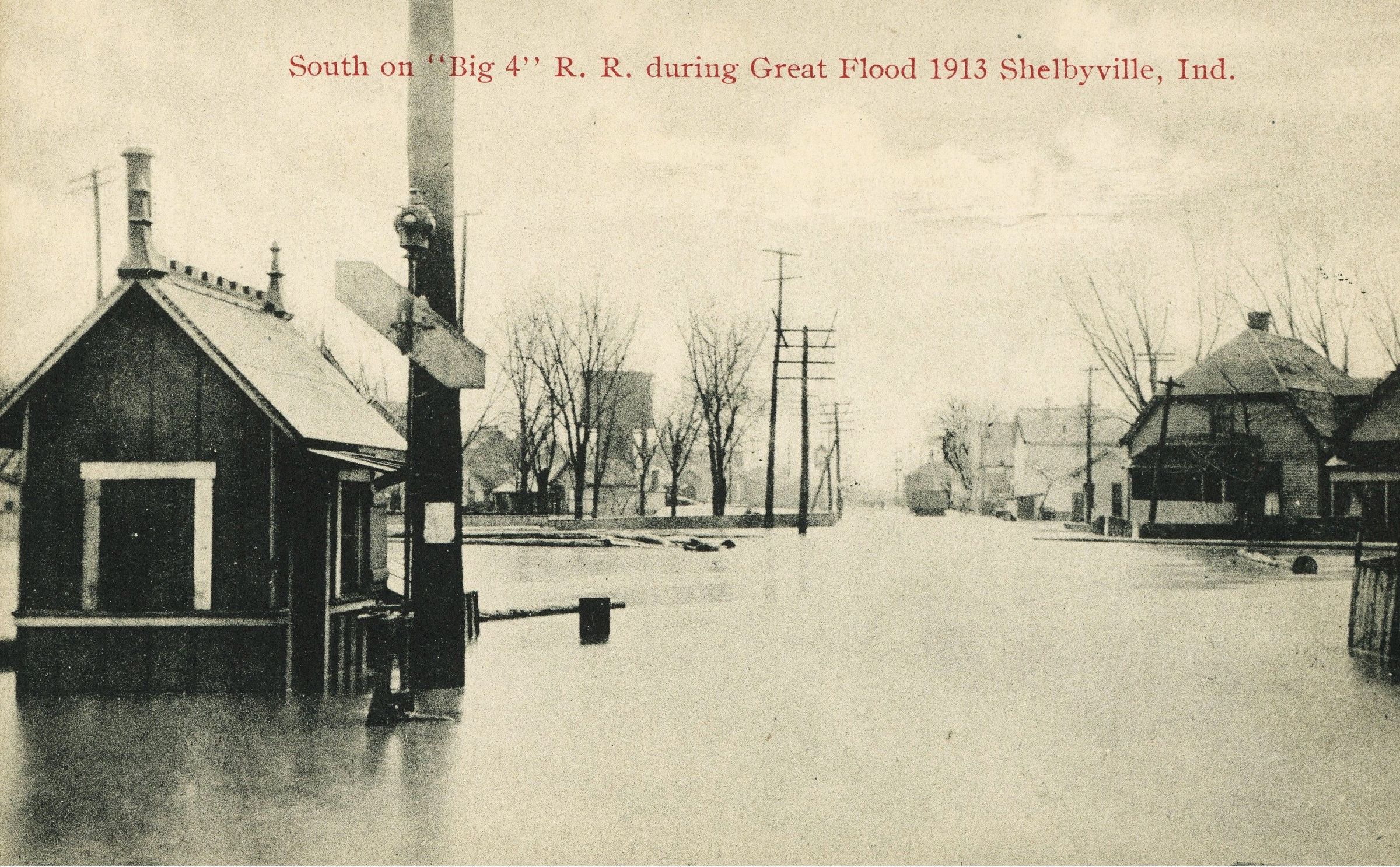 South on "Big 4" R.R. during the Great Flood on 1913 - Shelbyville IN - Looking down the tracks, which are covered with water.