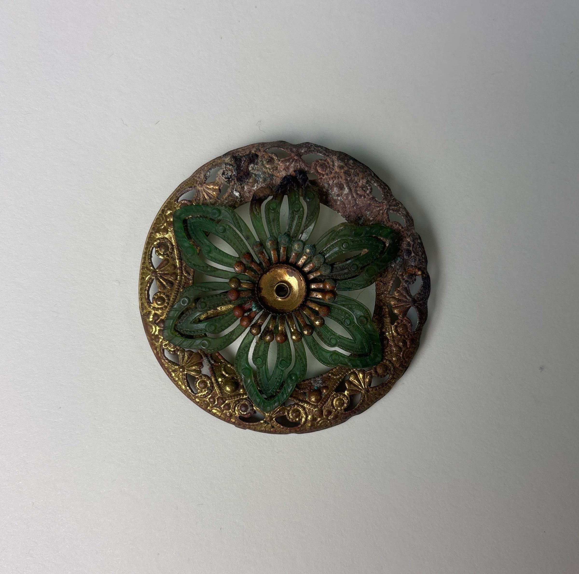 Circular brooch with central flower design. Golden trim around the flower, with ornate embossing and patterning throughout. Center seems to be missing a piece.Context