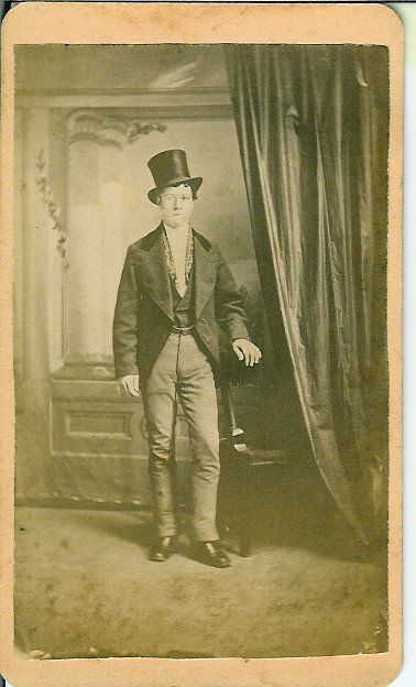 Black & white carte d'visite: subject is full frontal of a male standing against studio back drop, left hand on studio chair & curtain to his left; wearing stove pipe hat; dark coat has lapels extending to shoulders, collar is darker, possible velvet; little detail visible in dark vest, unusual patterned material around neck & down front of chest, maybe scarf, maybe lining of vest turned back, watch chain across vest; trousers are fine check pattern.