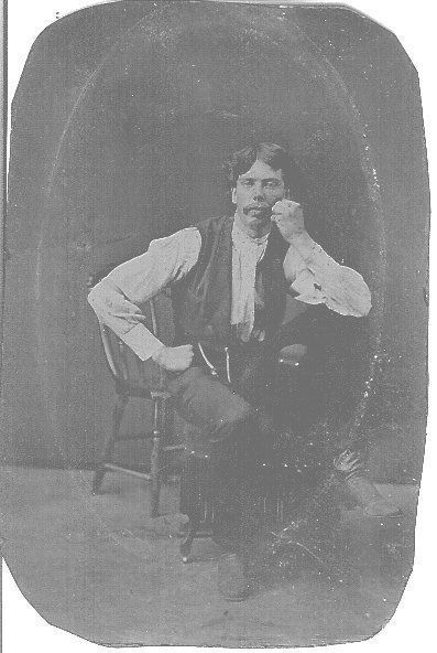 Tintype (sheet iron)-subject is full view of male sitting backwards on fringed studio chair; right leg (image reversed) hangs over back of chair & right arm rests on knee w/right hand against face; left foot on floor, left arm crooked w/hand against hip; dark, thick hair parted in middle, faint mustache, dark vest & trousers, possible watch chain on vest; appears to be sleeve garter on left arm; some red tinting in face; wearing boots.