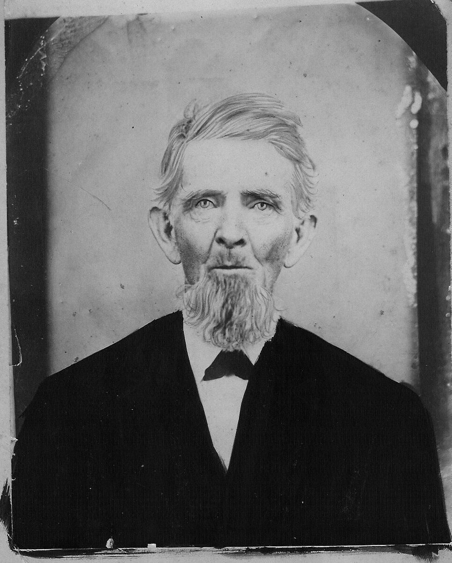 Unusual piece; appears to be photograph of a charcoal drawing secured to a mount. Subject is upper torso, older male, square to camera; light-colored hair, parted on right and loosely combed; long, light chin whiskers or goatee; wearing stock for a tie, no details visible in other clothes; dark blue or black watercolor used to color coat and vest; however this work done hastily as brush strokes extended onto mount. Used by Grover Family. Donation, 04/16/1988.