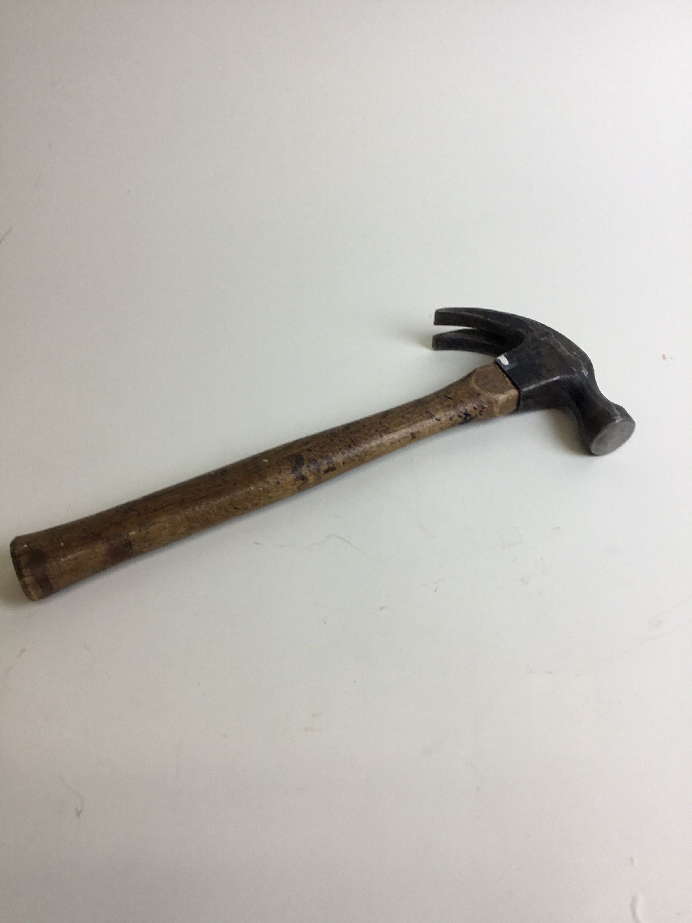 Claw hammer, metal head for driving nails, a split end for pulling nails, a 13.5" wooden handle.Collection